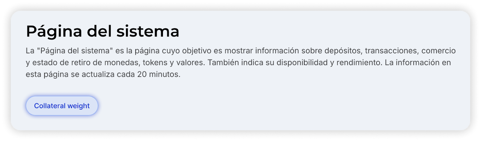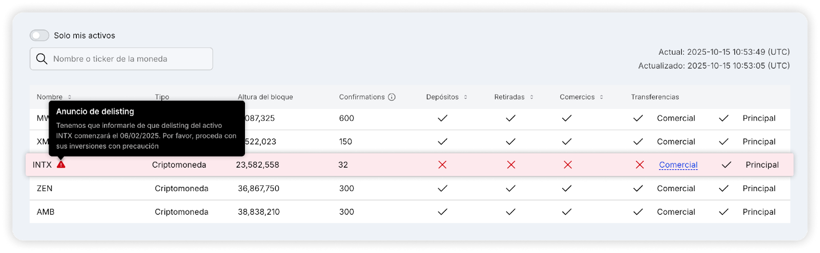 También se puede encontrar aquí información adicional sobre monedas específicas. Por ejemplo, si un activo se encuentra en proceso de deslistado, en la página se mostrará un mensaje correspondiente.
