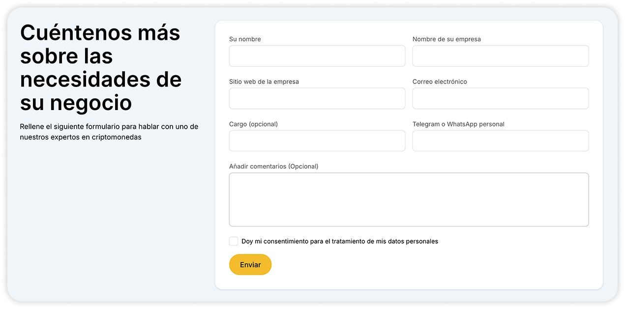 - Envíe una solicitud en el sitio web de WhiteBIT for Business (página Payments for Businesses).