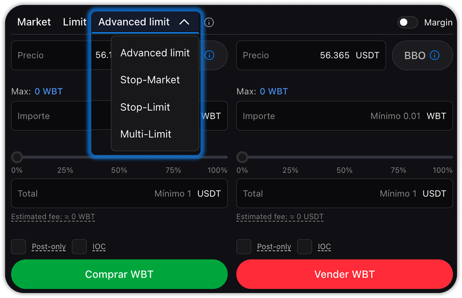 - Orden limitada avanzada (incluye opciones adicionales: Post-only evita comisiones como taker, BBO mejora la posición en la cola, IOC cancela de inmediato las partes no ejecutadas)