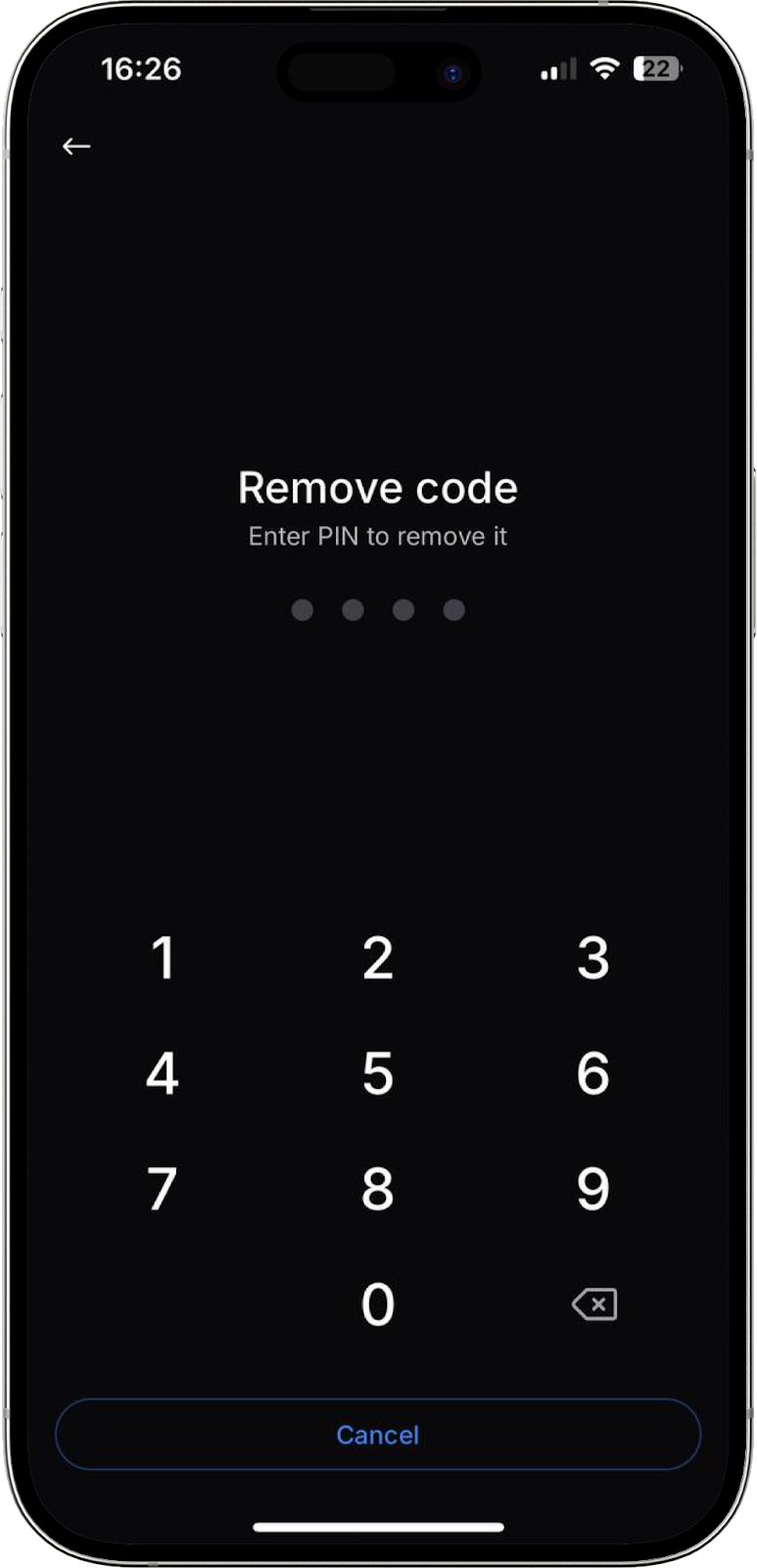 Puede establecer o eliminar un PIN necesario para iniciar sesión en la aplicación móvil. Para crearlo, introduzca un código de 4 dígitos y confírmelo. Para eliminarlo, introduzca el PIN previamente creado.
