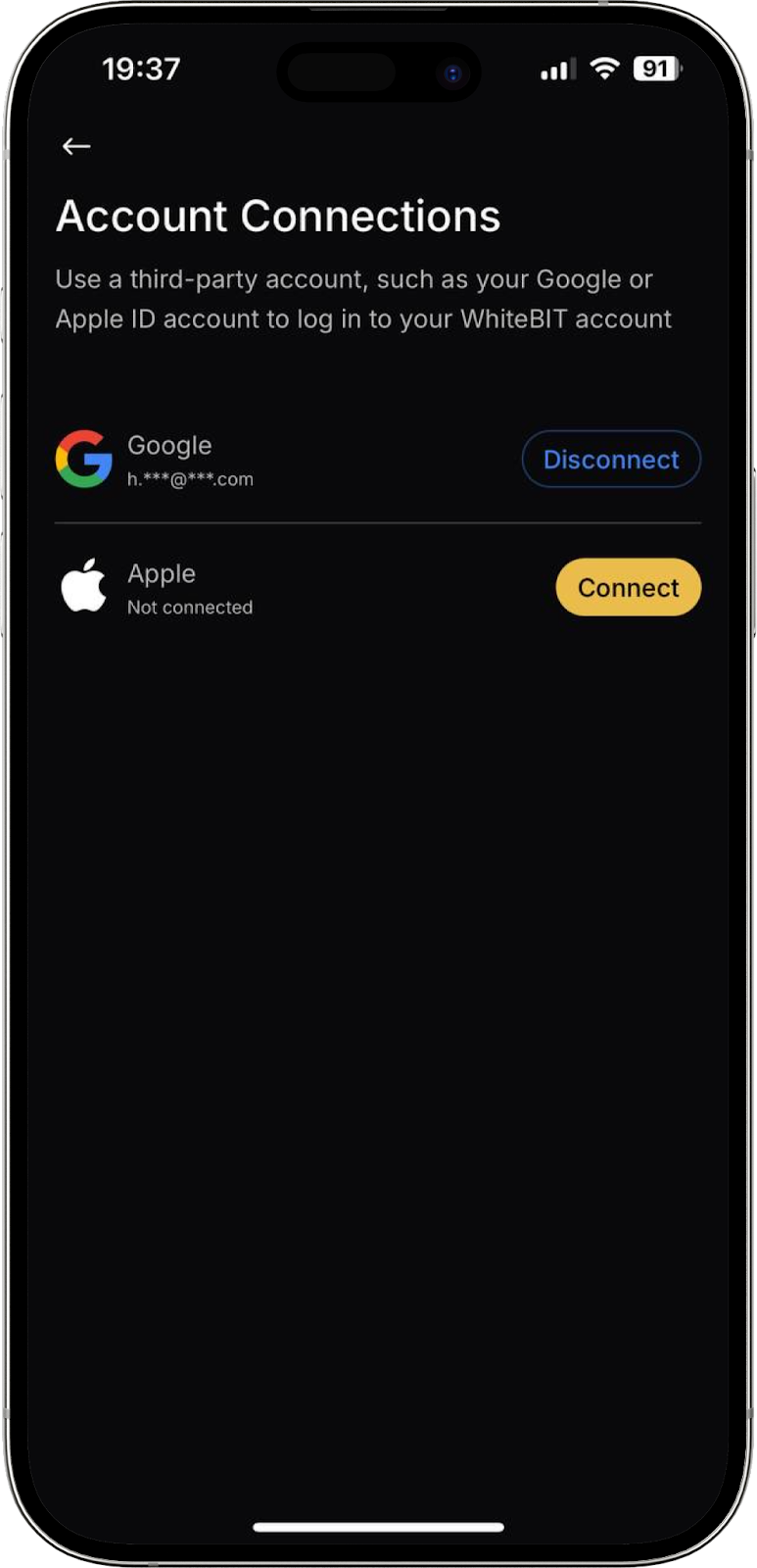 Aquí puede añadir o desvincular una cuenta externa, como Google o Apple ID, para iniciar sesión en su cuenta de WhiteBIT.