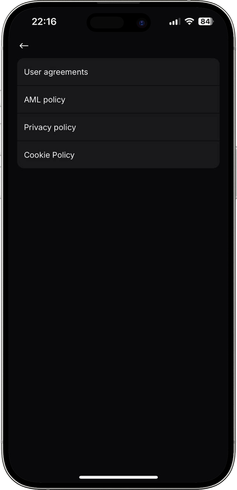En esta sección puede consultar el Acuerdo de Usuario, la Política AML, la Política de Privacidad y la Política de Cookies.