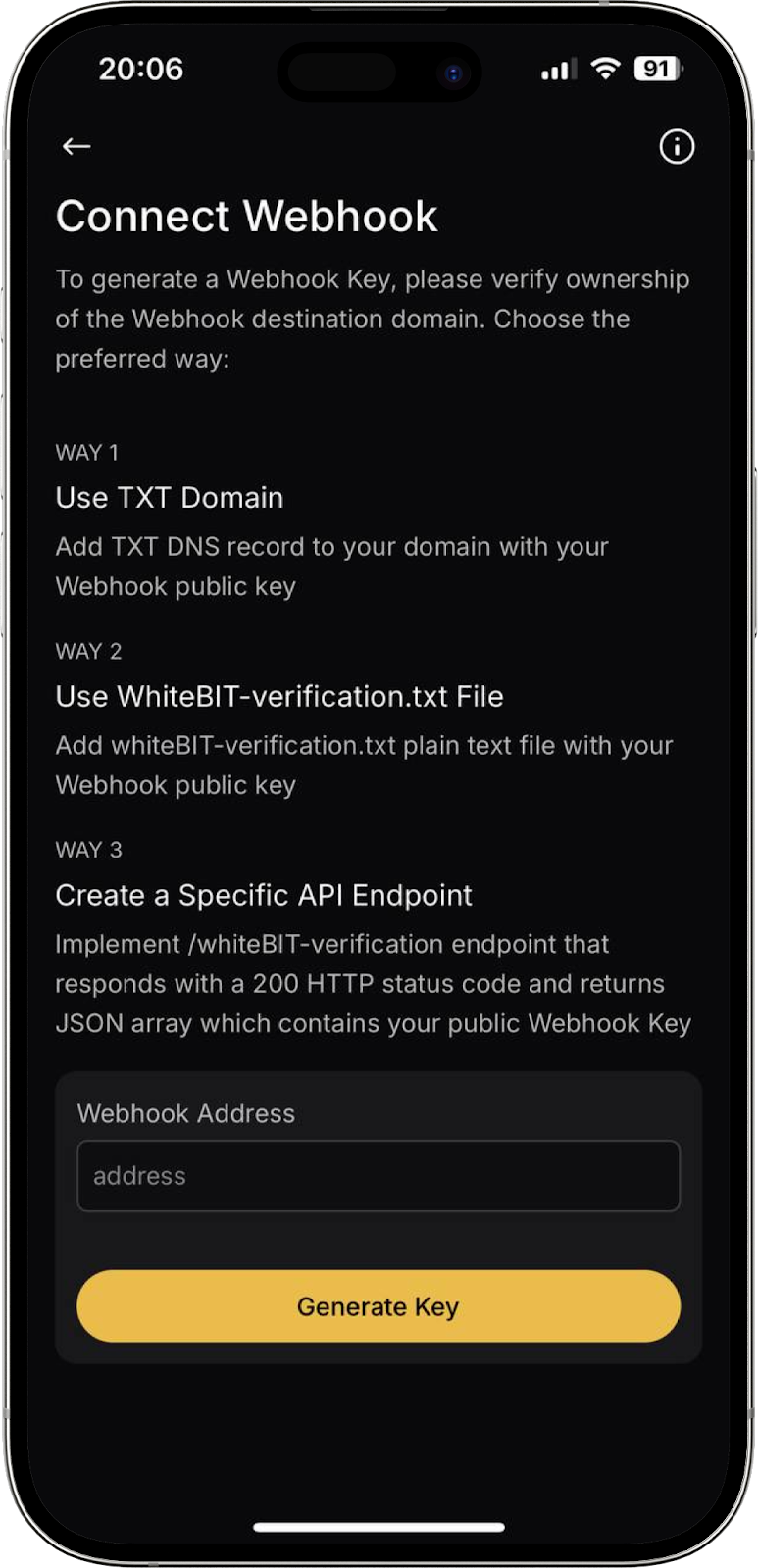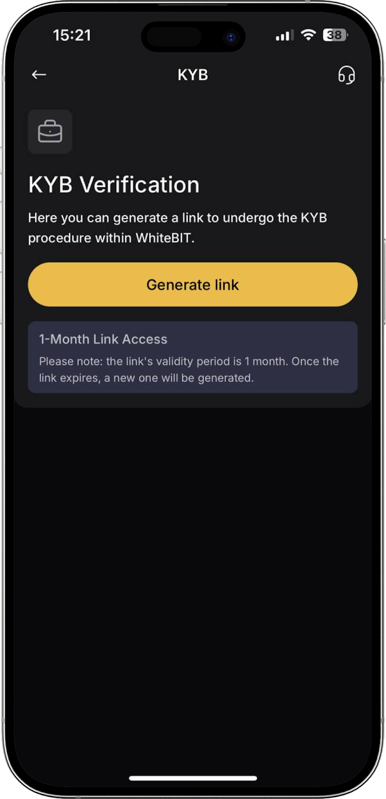 Aquí puede generar un enlace para completar el procedimiento KYB (verificación de datos para usuarios que desean crear una cuenta corporativa en WhiteBIT) y consultar el estado actual de su solicitud.