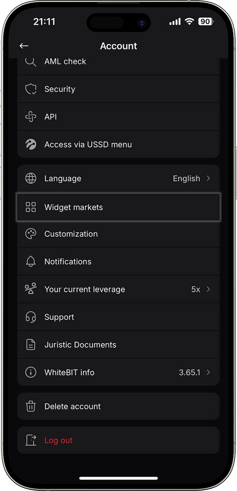- Idioma, Widgets de mercados, Personalización, Notificaciones, Su apalancamiento actual, Soporte, Documentos legales, Información sobre WhiteBIT.
