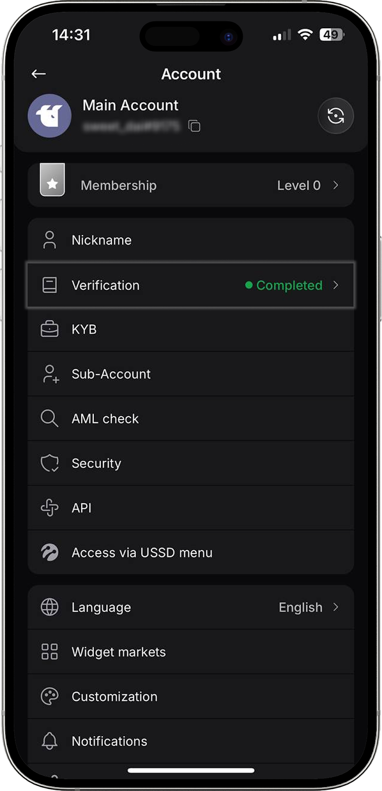 Al pulsar la sección “Verificación”, puede ver el estado actual de su verificación KYC, los niveles disponibles y una breve descripción de cada uno. Desde esta sección también puede iniciar el proceso de verificación para un nivel específico. Puede encontrar más información en el Centro de Ayuda.