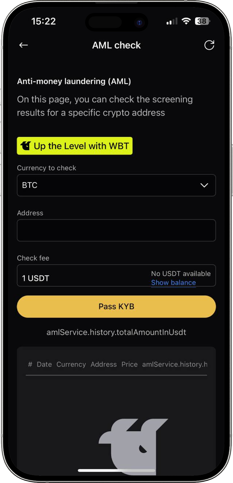 En esta página puede comprobar si una dirección está relacionada con el lavado de dinero. Solo los usuarios que hayan completado la verificación KYB pueden realizar esta comprobación. Solo necesita seleccionar la moneda, introducir la dirección y pagar 1 USDT por verificación. También puede consultar el historial de verificaciones anteriores.
