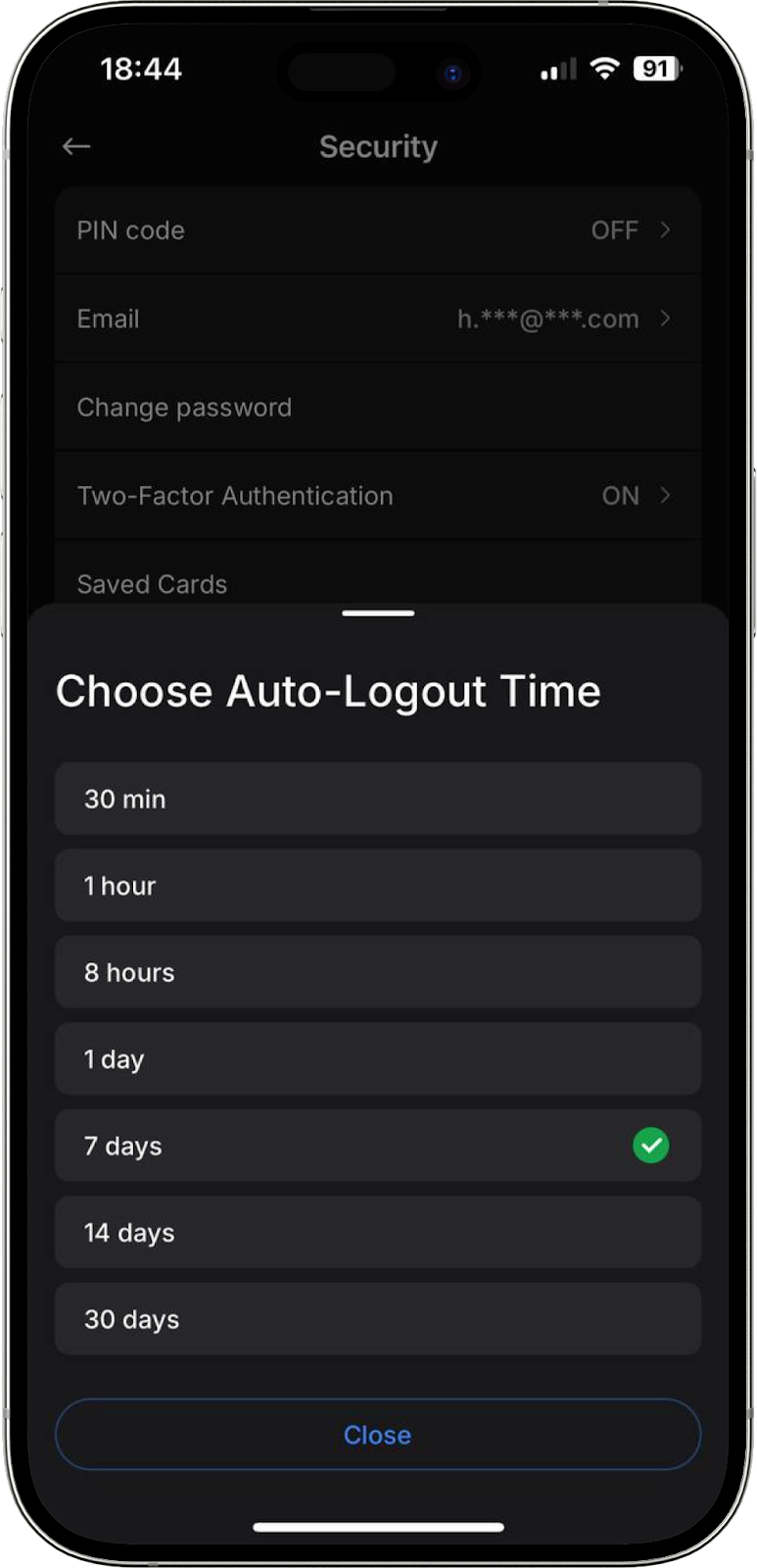 En este bloque puede establecer el tiempo de cierre automático de sesión en caso de inactividad. Si ha iniciado sesión y olvidó cerrarla, la función bloqueará el acceso a su cuenta en el dispositivo desde el cual accedió. Los intervalos disponibles son: 30 minutos, 1 hora, 8 horas, 1 día, 7 días, 14 días y 30 días.