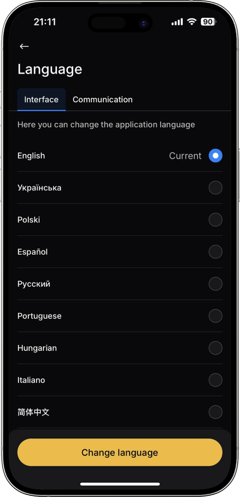 Al acceder a la pestaña “Idioma”, podrá cambiar el idioma de la aplicación o de las comunicaciones (correos electrónicos del sistema/marketing y notificaciones push). Seleccione “Interfaz” o “Comunicación”, elija un idioma de la lista y pulse “Cambiar idioma”.