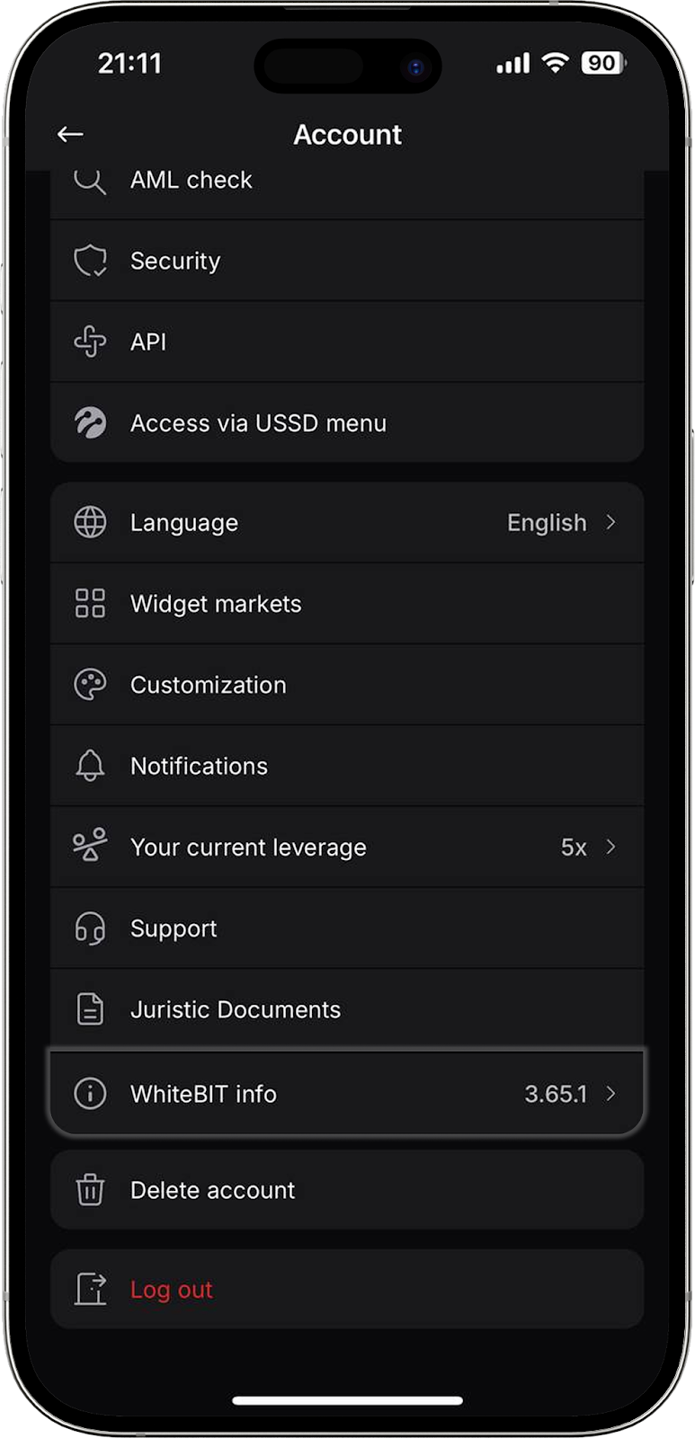 Al pulsar este botón, puede cerrar sesión en su cuenta de WhiteBIT en la aplicación móvil.