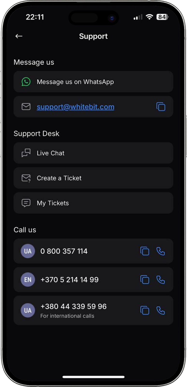 Al pulsar “Soporte” en la aplicación, se abrirá una página con todas las opciones disponibles para contactar con nuestro servicio de atención: chat en línea, creación de ticket, correo electrónico, llamada telefónica o WhatsApp.