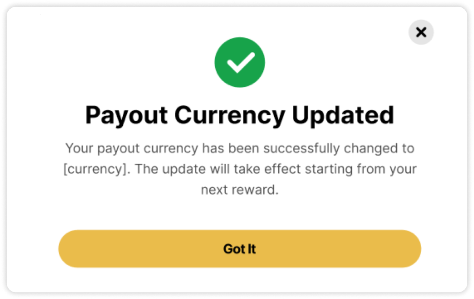 La moneda seleccionada se aplicará a partir del próximo pago de recompensa.