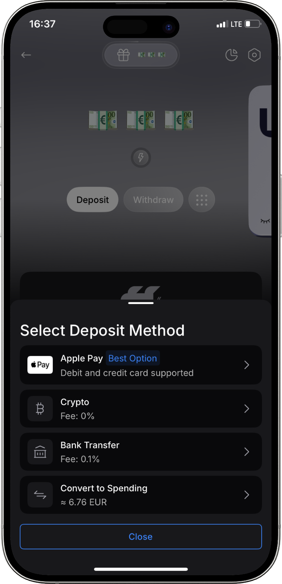 Los detalles de esta función están disponibles en la pestaña principal debajo del importe del saldo total. Al hacer clic en el símbolo del rayo, se abrirá una ventana emergente con una breve descripción de la función. Después de leer esta información, podrá acceder a la lista de activos compatibles disponibles en el saldo principal. En esta pestaña podrá ver el saldo total y el importe equivalente en EUR que estará disponible tras la conversión de activos, así como el potencial de cashback (el importe de cashback potencial si los activos seleccionados se convierten y se gastan). También puede seleccionar monedas específicas que desee convertir. Después deberá hacer clic en “Continuar” y confirmar la transacción de conversión. El importe correspondiente aparecerá inmediatamente en el saldo de su tarjeta.