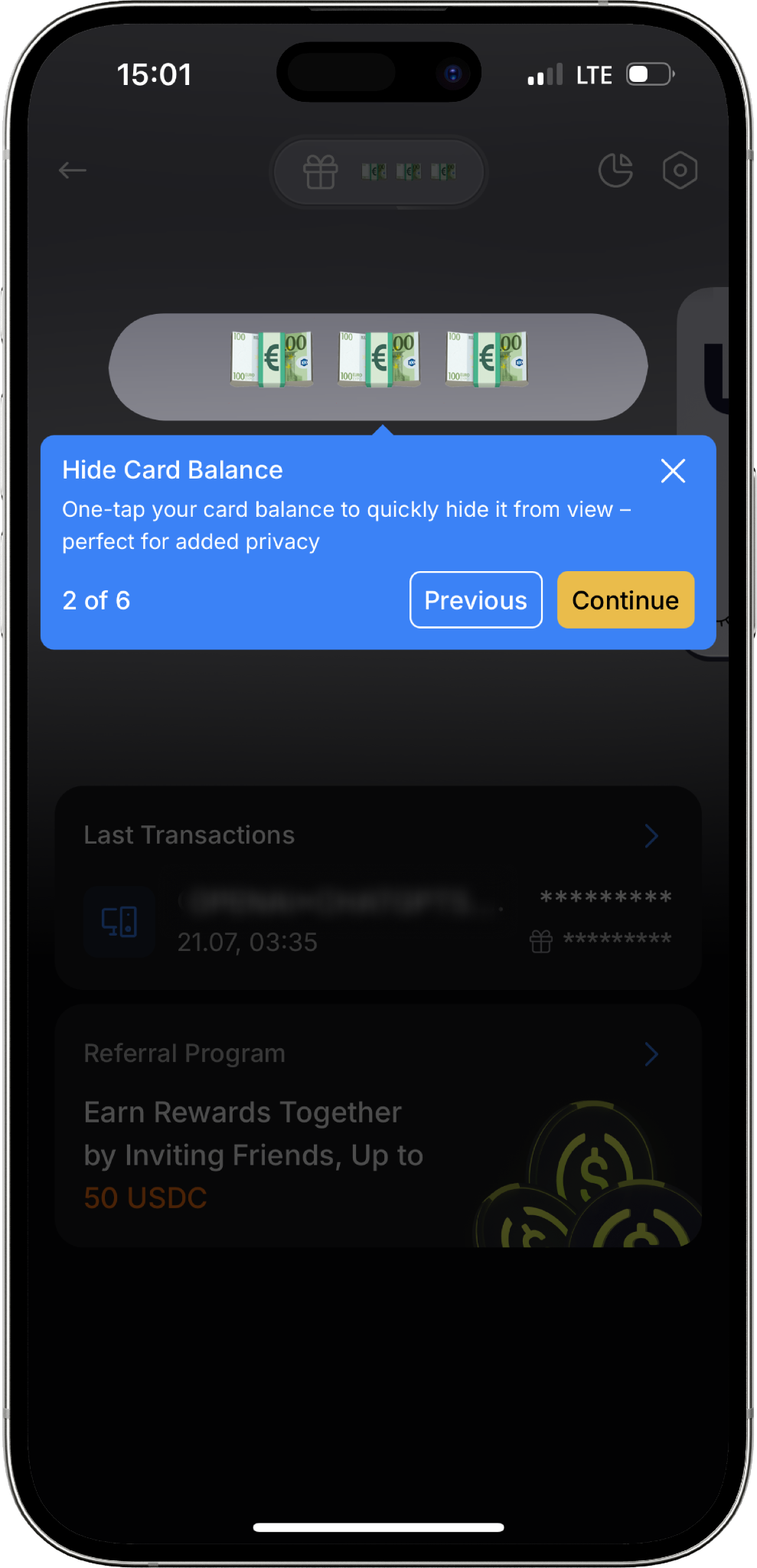 Para mayor privacidad, puede ocultar su saldo y cashback tocando el importe. El fondo de la tarjeta se difumina automáticamente según el diseño seleccionado.