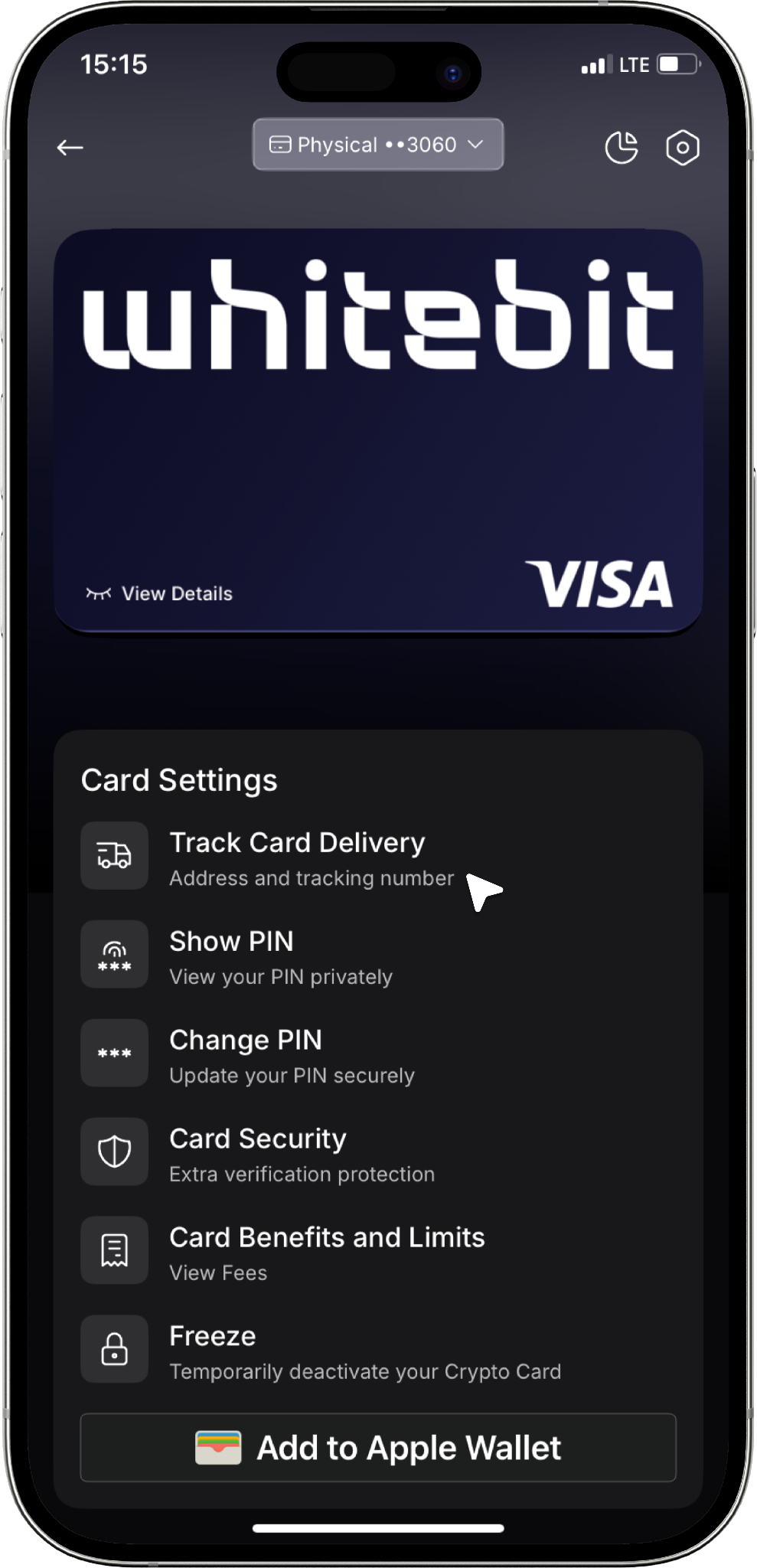 Si no ha recibido la tarjeta dentro del plazo de entrega indicado, primero debe congelar la tarjeta física en su configuración, en la pestaña con la imagen de la tarjeta. Después de esto, contacte con nuestro equipo de soporte (envíe un correo a support@whitebit.com), describa su solicitud en detalle y proporcione su consentimiento para cerrar la tarjeta física. Podrá solicitar una nueva tarjeta después de que la actual sea cerrada.
