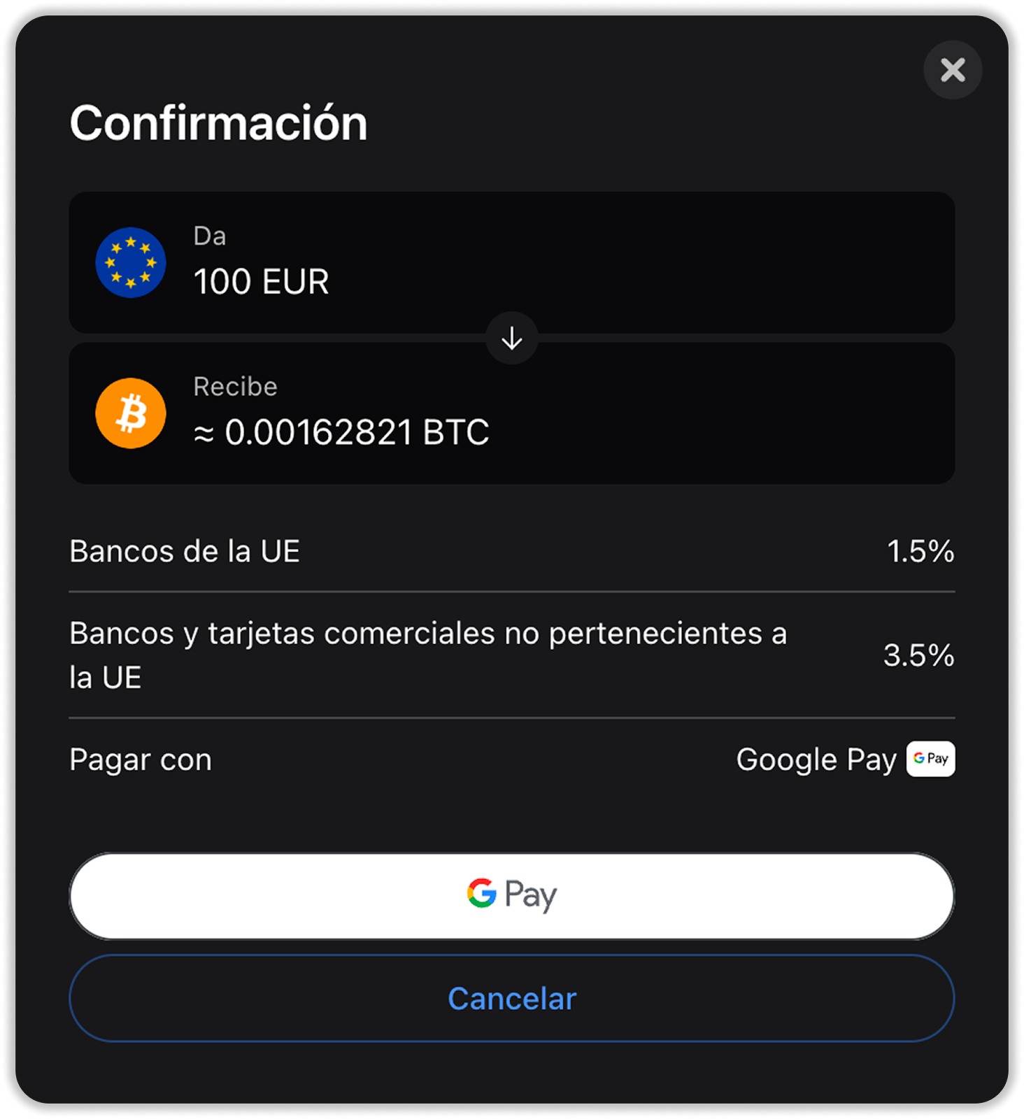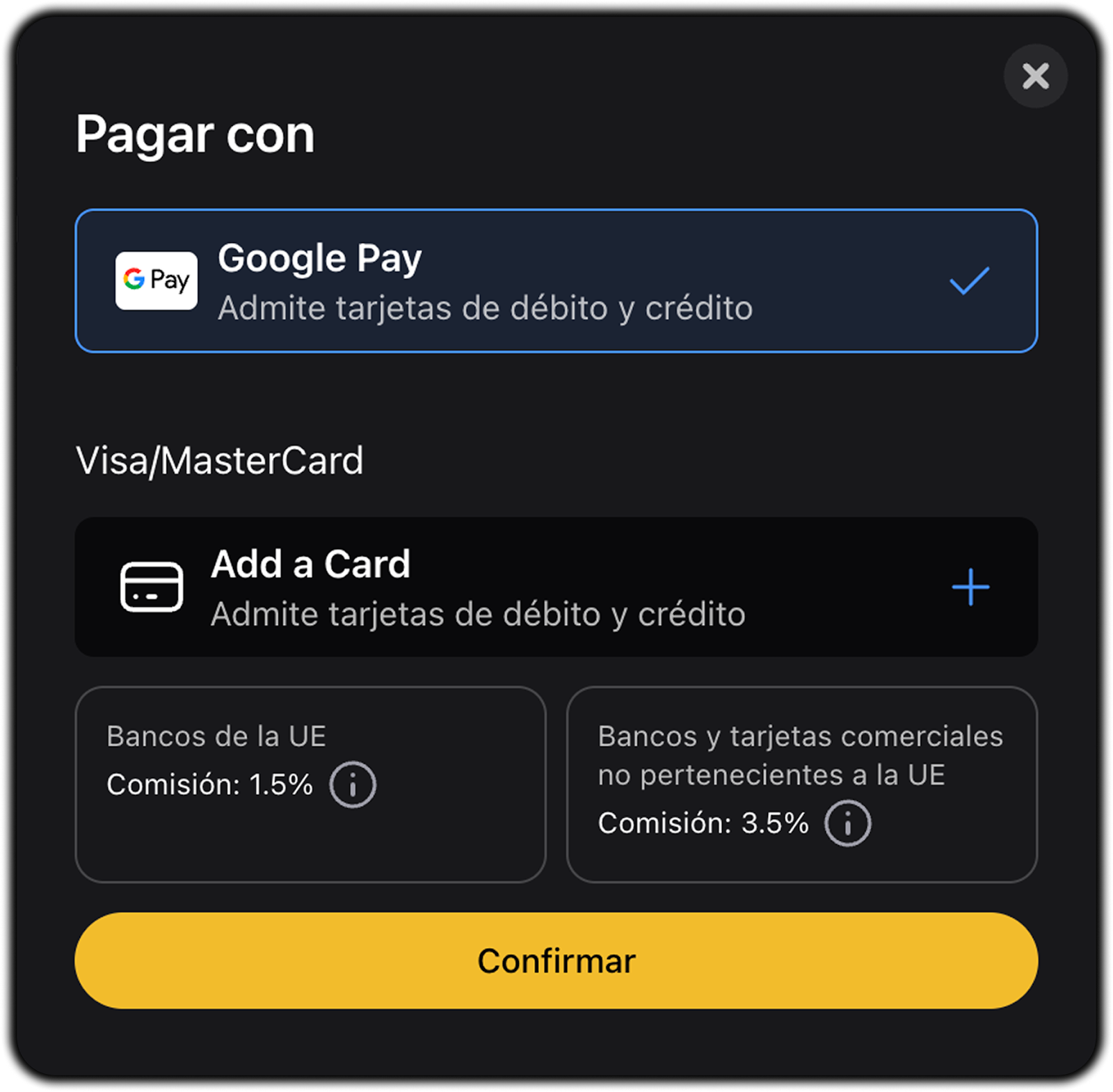 - Debajo de los métodos de pago puede consultar las comisiones. La comisión por pagar mediante Apple Pay/Google Pay y tarjetas Visa/Mastercard es del 1,5% para bancos de la UE o del 3,5% para bancos de países fuera de la UE, así como para tarjetas comerciales.