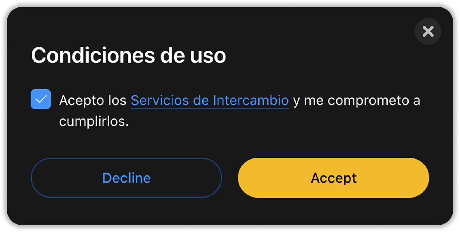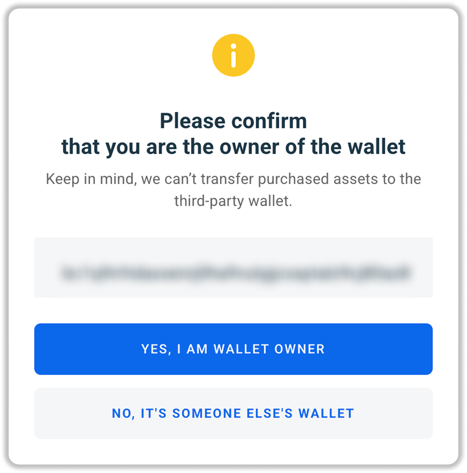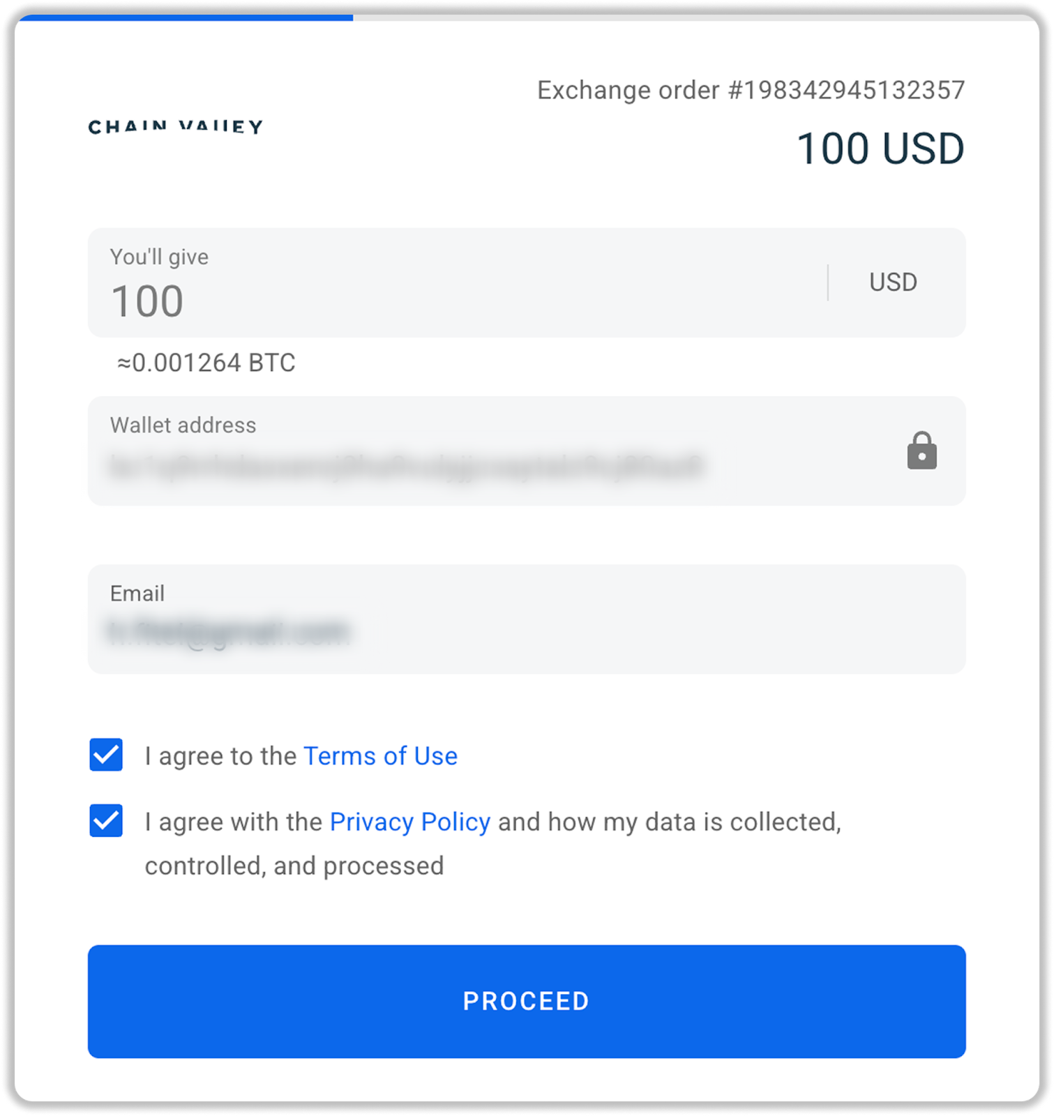 - En la siguiente etapa se abrirá una ventana con los detalles de su transacción (monto de pago, cantidad de criptomoneda que recibirá en su saldo y monto de la comisión). Usted deberá aceptar los Términos de uso del servicio, la Política de privacidad y confirmar la compra. También debe confirmar que es propietario de la cartera y de su correo electrónico, ingresando un código de un solo uso.