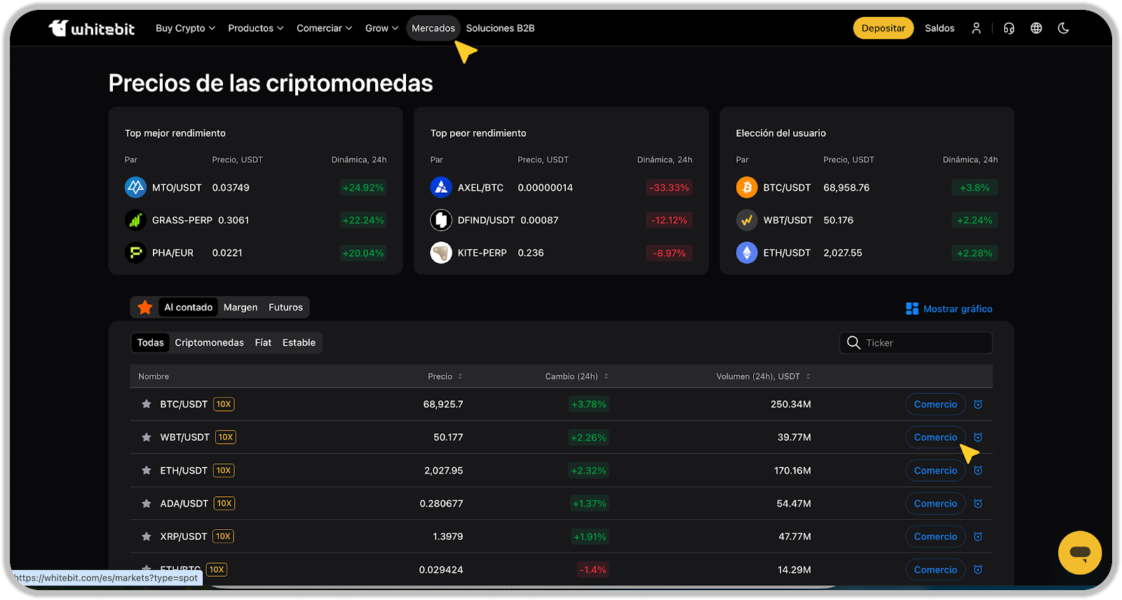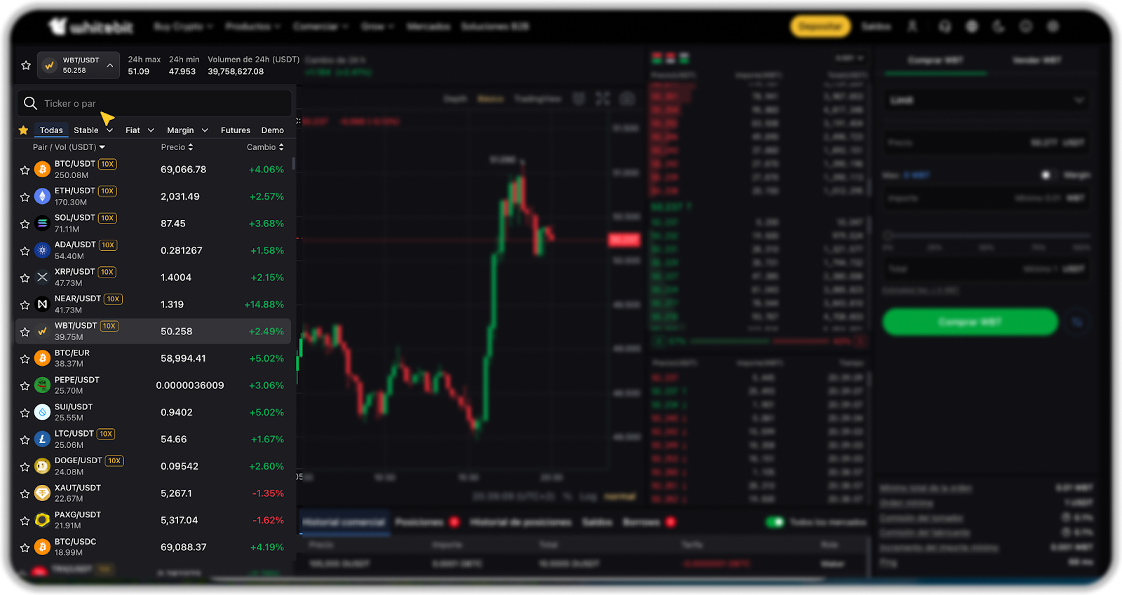 Como se menciona en el artículo sobre tipos de órdenes en WhiteBIT, puede utilizar cualquiera de ellos dependiendo de sus objetivos y estrategias comerciales. Echemos un vistazo práctico a cómo trabajar con órdenes en la versión web del intercambio.