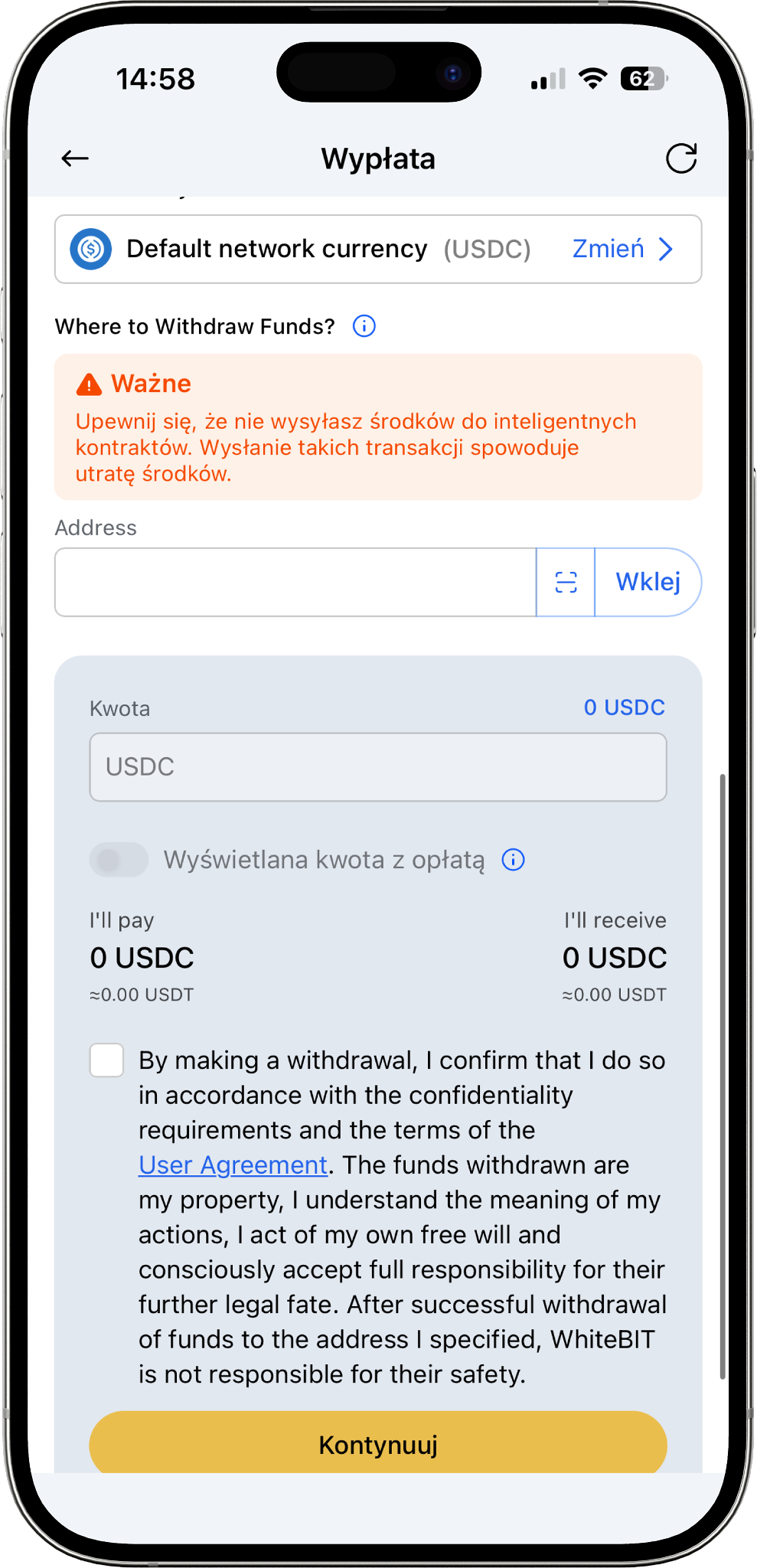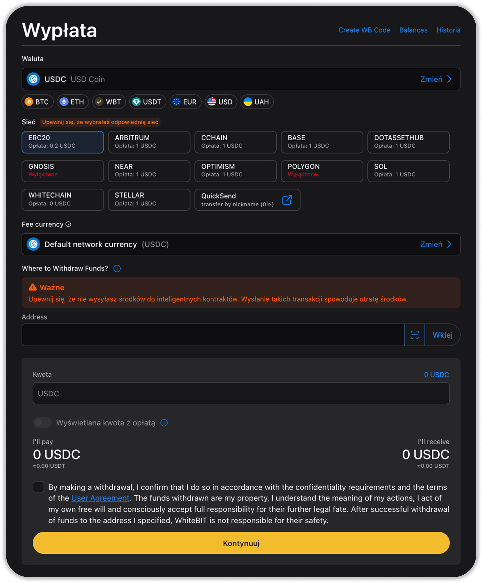 Zapoznaj się z ważnymi informacjami u góry okna wypłaty. Wybierz sieć (jeśli to konieczne), wybierz walutę, w której zostanie pobrana opłata za przelew środków, wprowadź adres wypłaty lub zeskanuj kod QR adresu na platformie odbiorczej, podaj kwotę i kliknij przycisk "Kontynuuj".