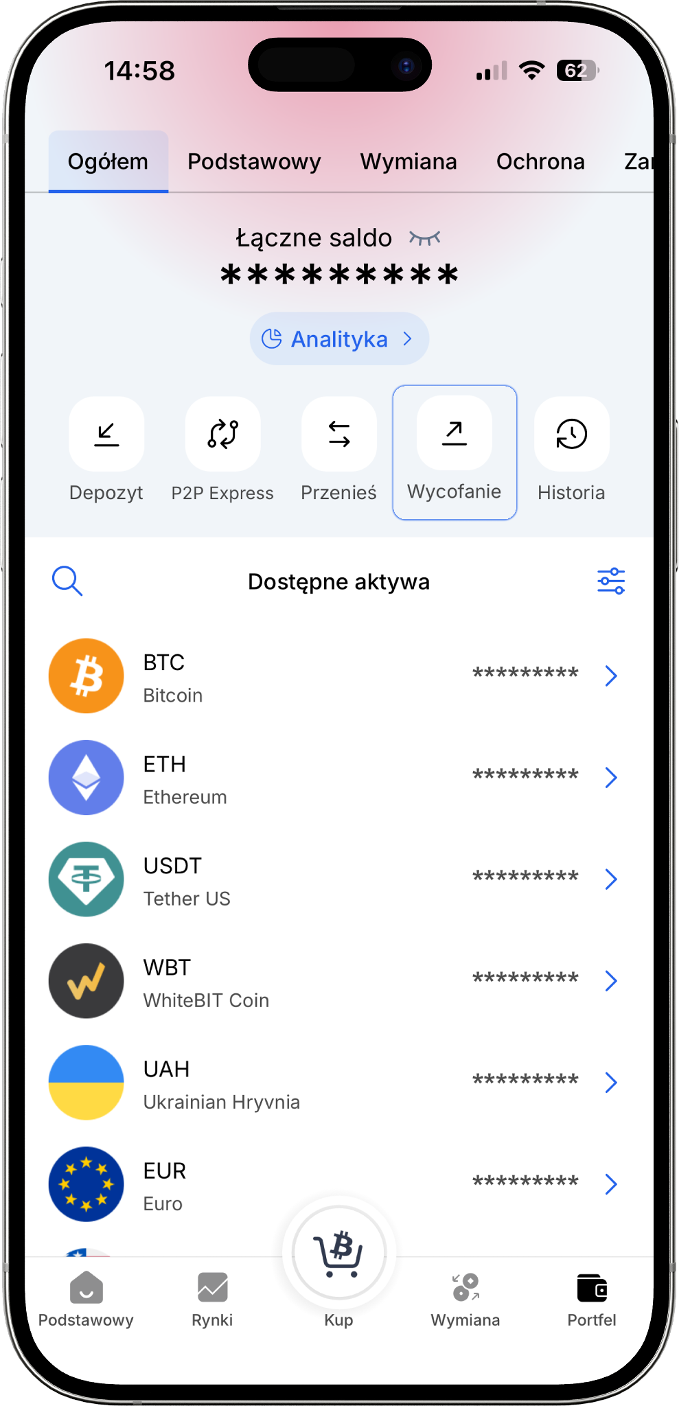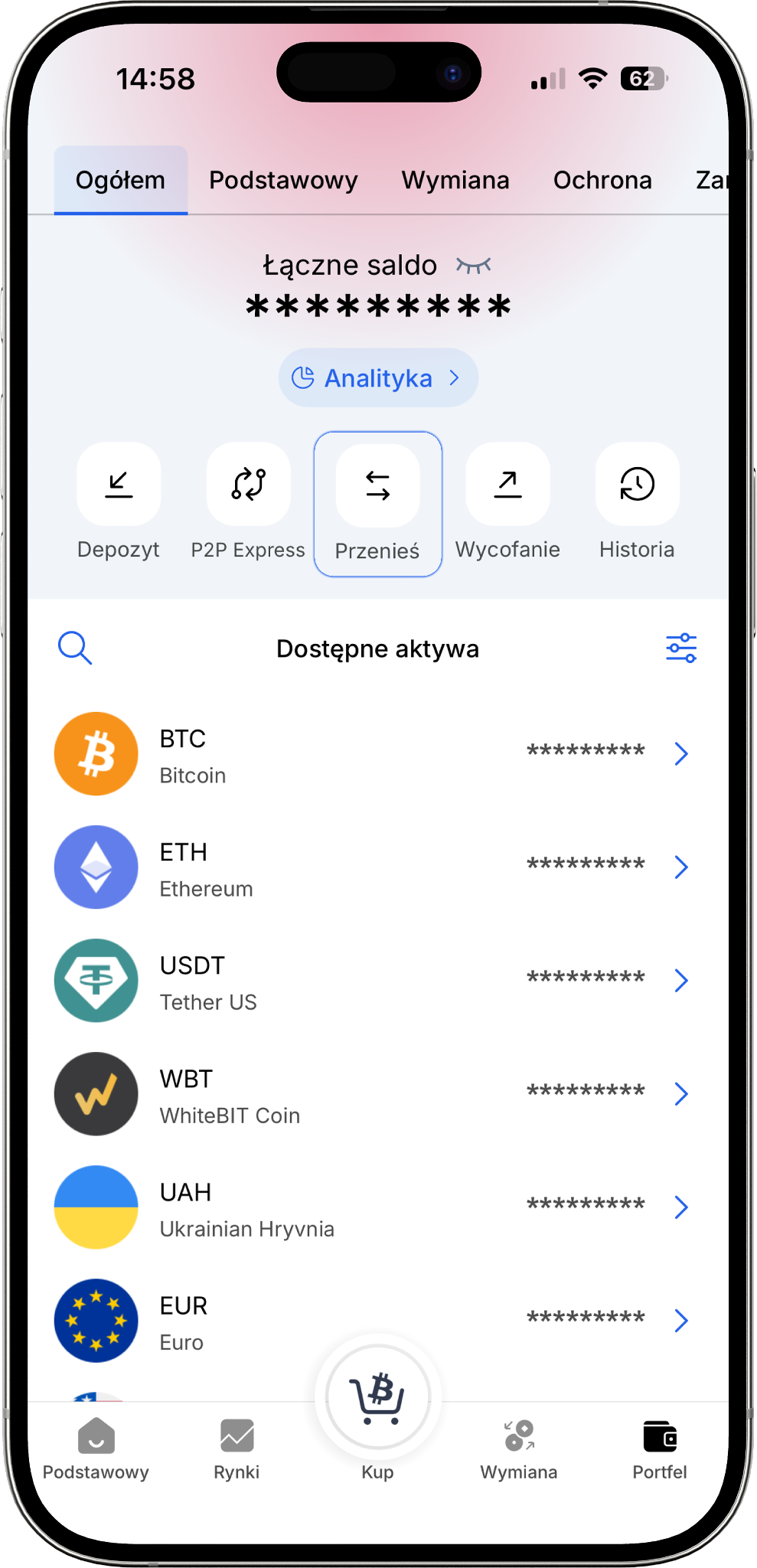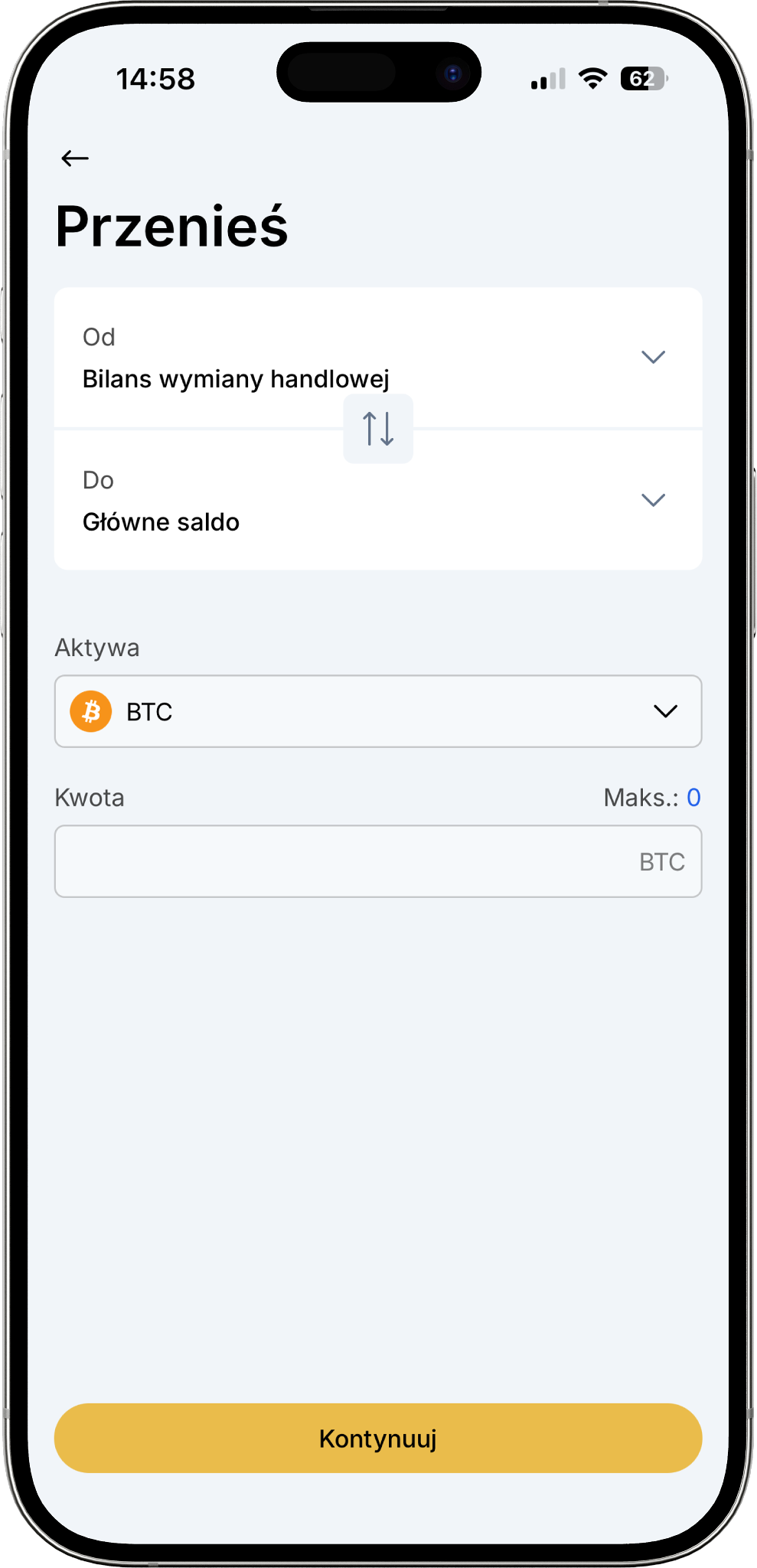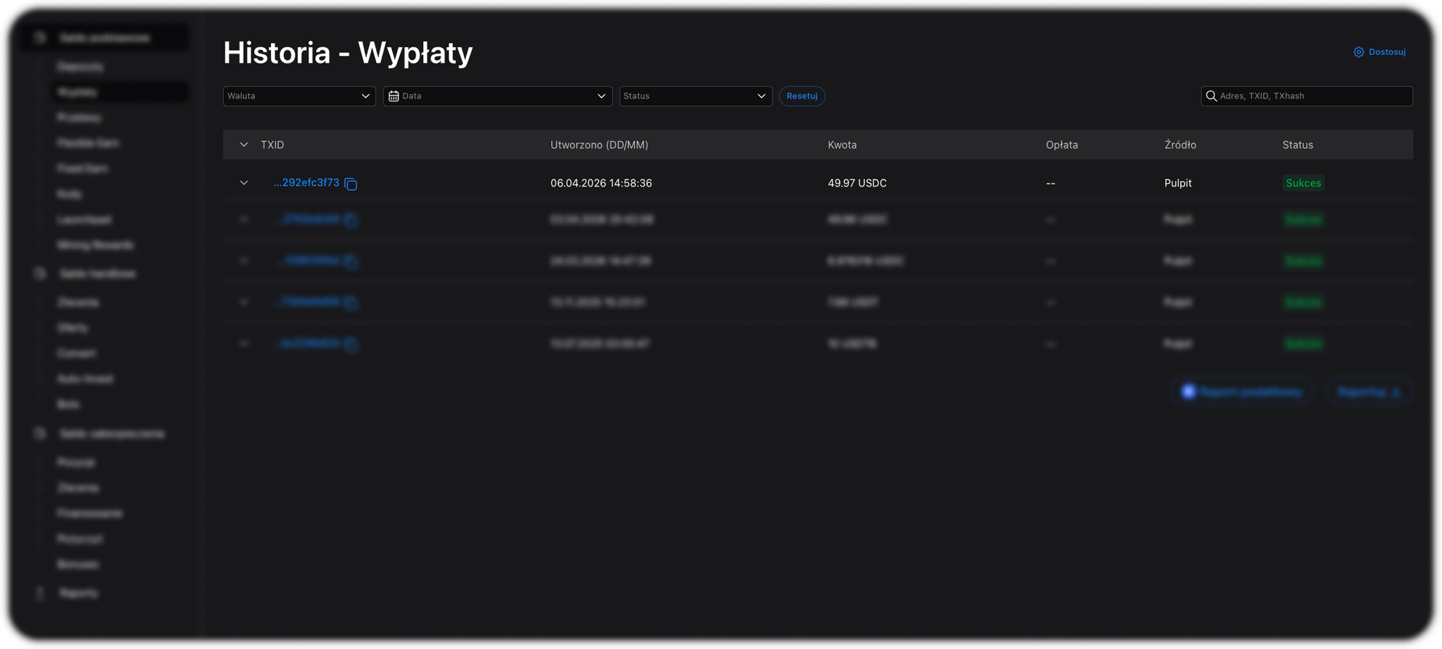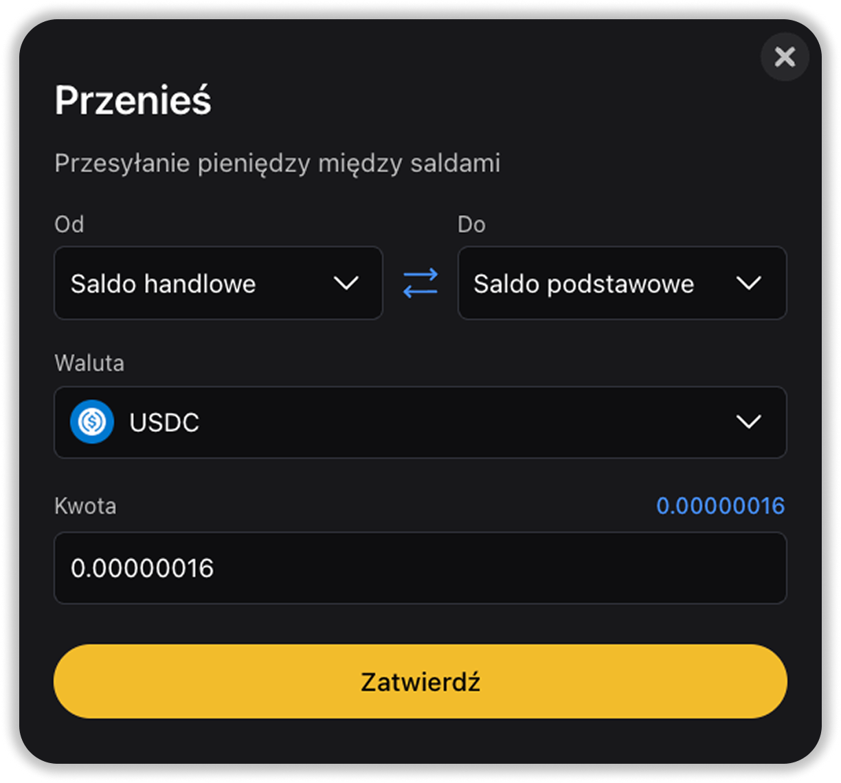 Przed dokonaniem wypłaty upewnij się, że pożądany aktyw znajduje się na твоєму "Podstawowym" saldzie. Transfer między saldami dokonuje się ręcznie za pomocą przycisku "Transfer" w zakładce "Portfel".