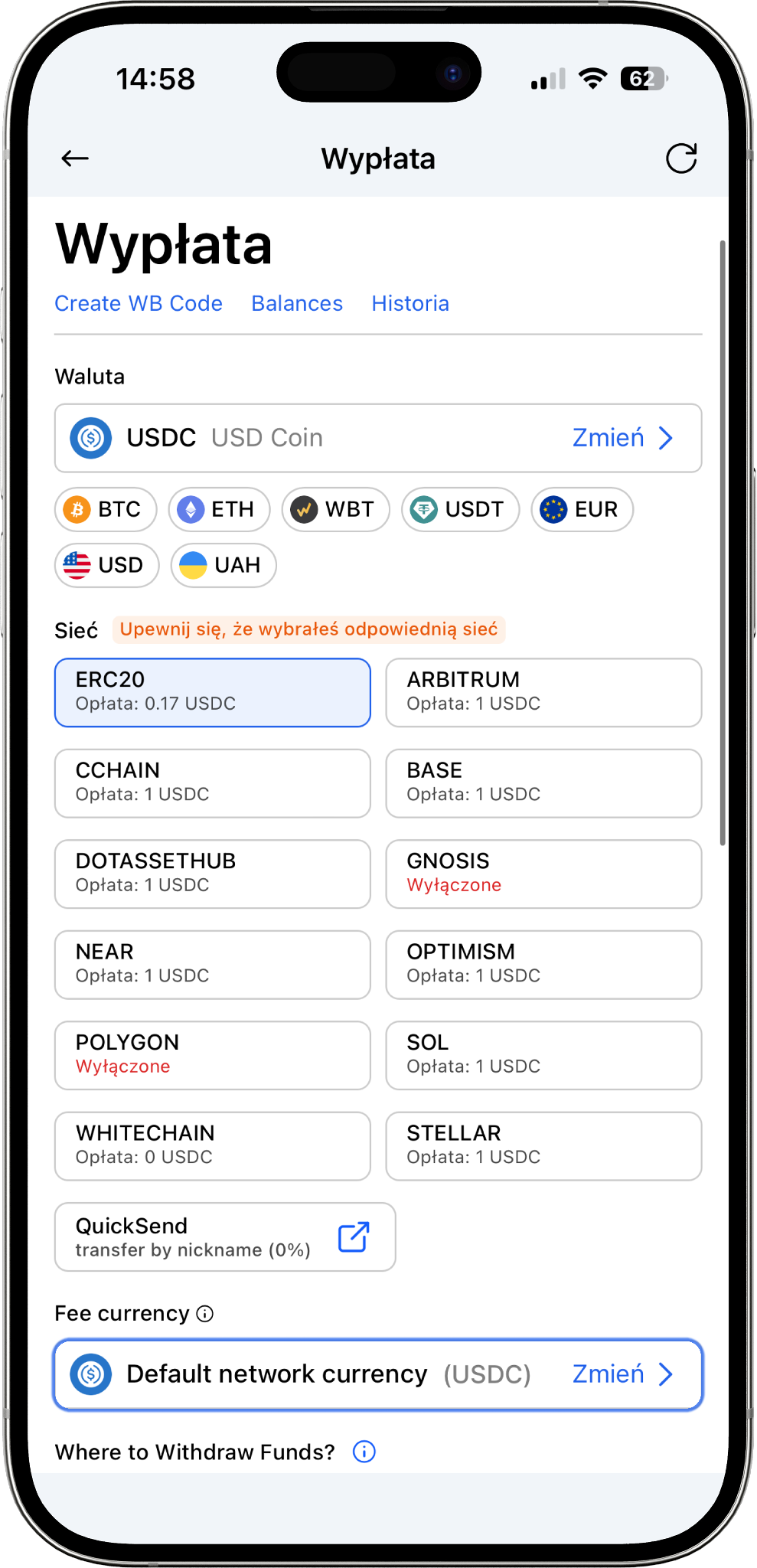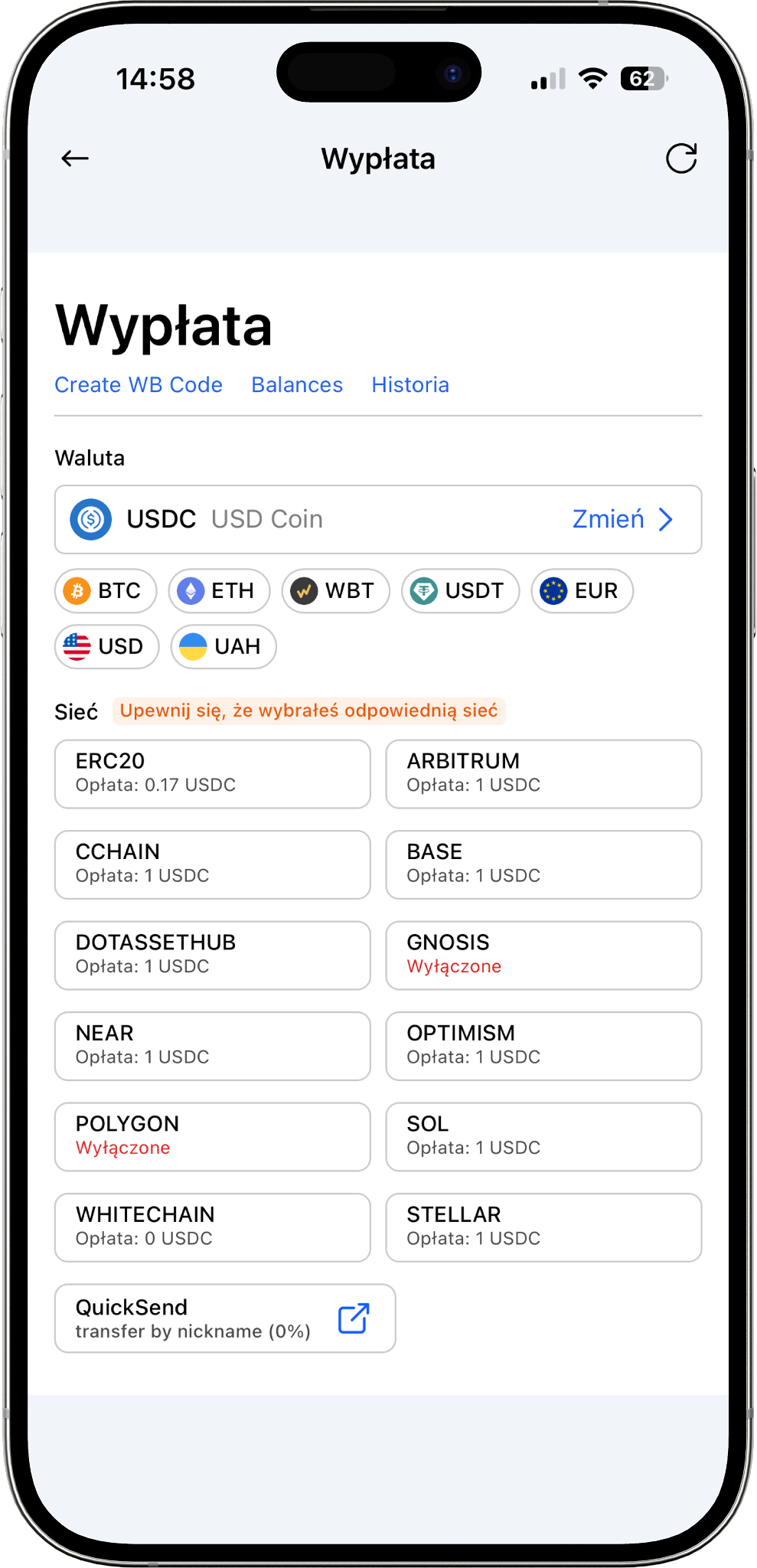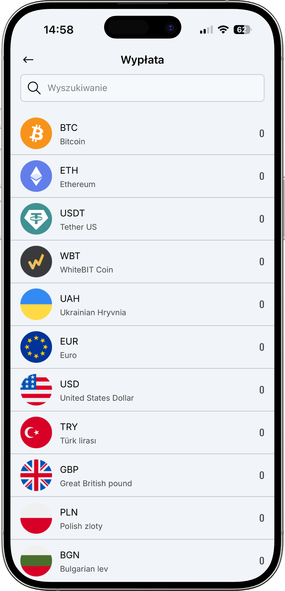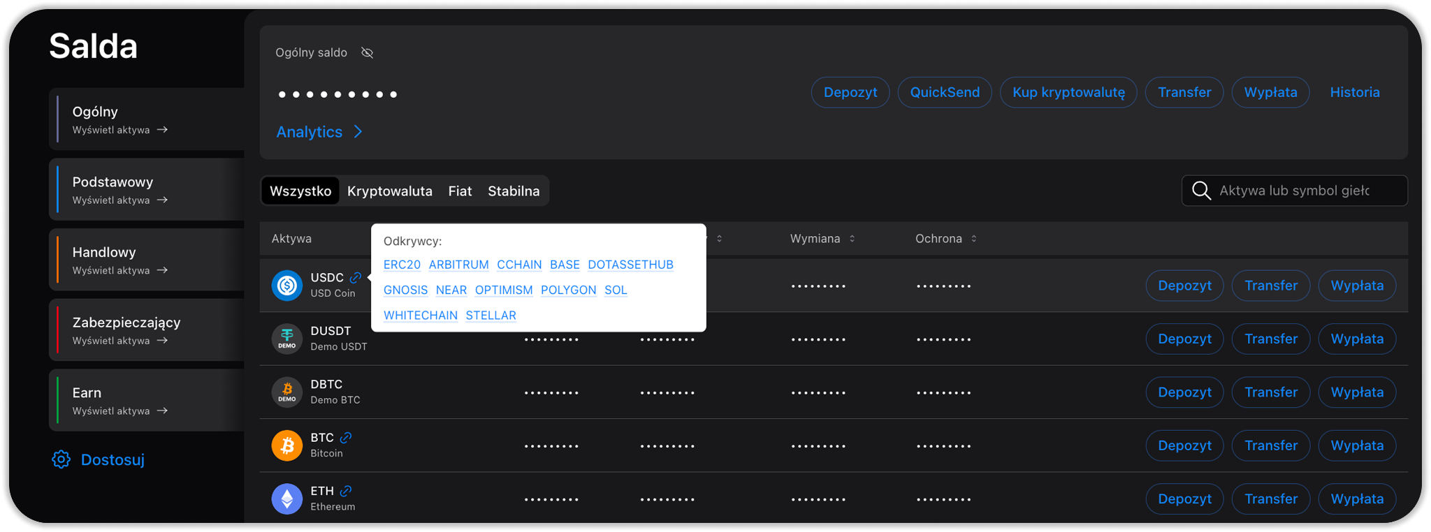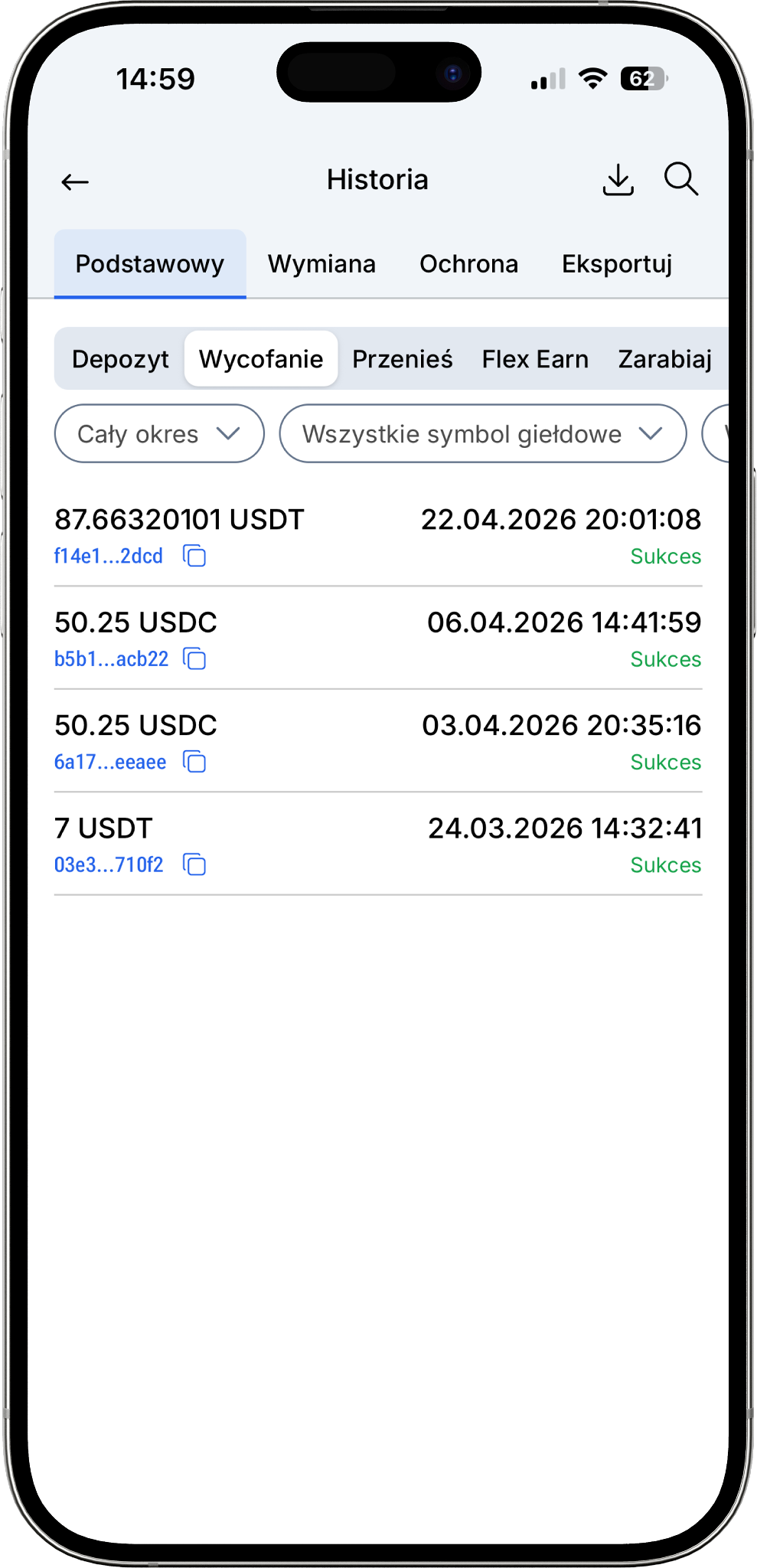 Przed dokonaniem wypłaty upewnij się, że pożądany aktyw znajduje się na твоєму "Podstawowym" saldzie. Transfer między saldami dokonuje się ręcznie za pomocą przycisku "Transfer" w zakładce "Portfel".