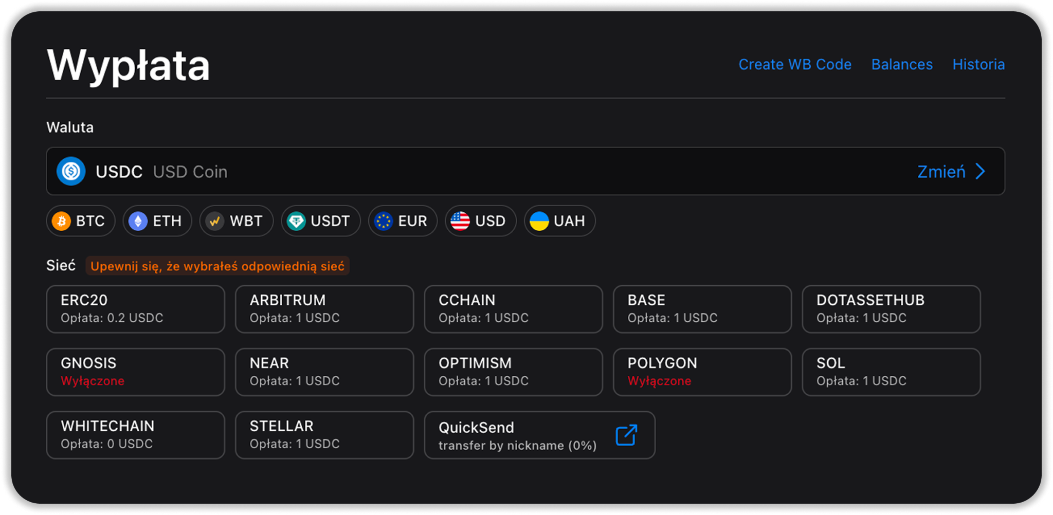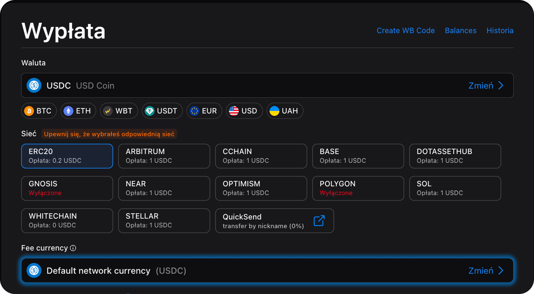 Zapoznaj się z ważnymi informacjami u góry okna wypłaty. Wybierz sieć, przez którą zostanie dokonana wypłata, wybierz walutę, w której zostanie pobrana opłata za przelew środków, wklej adres, na który zostaną wysłane środki (można go znaleźć na platformie odbiorczej), a także podaj kwotę wypłaty.