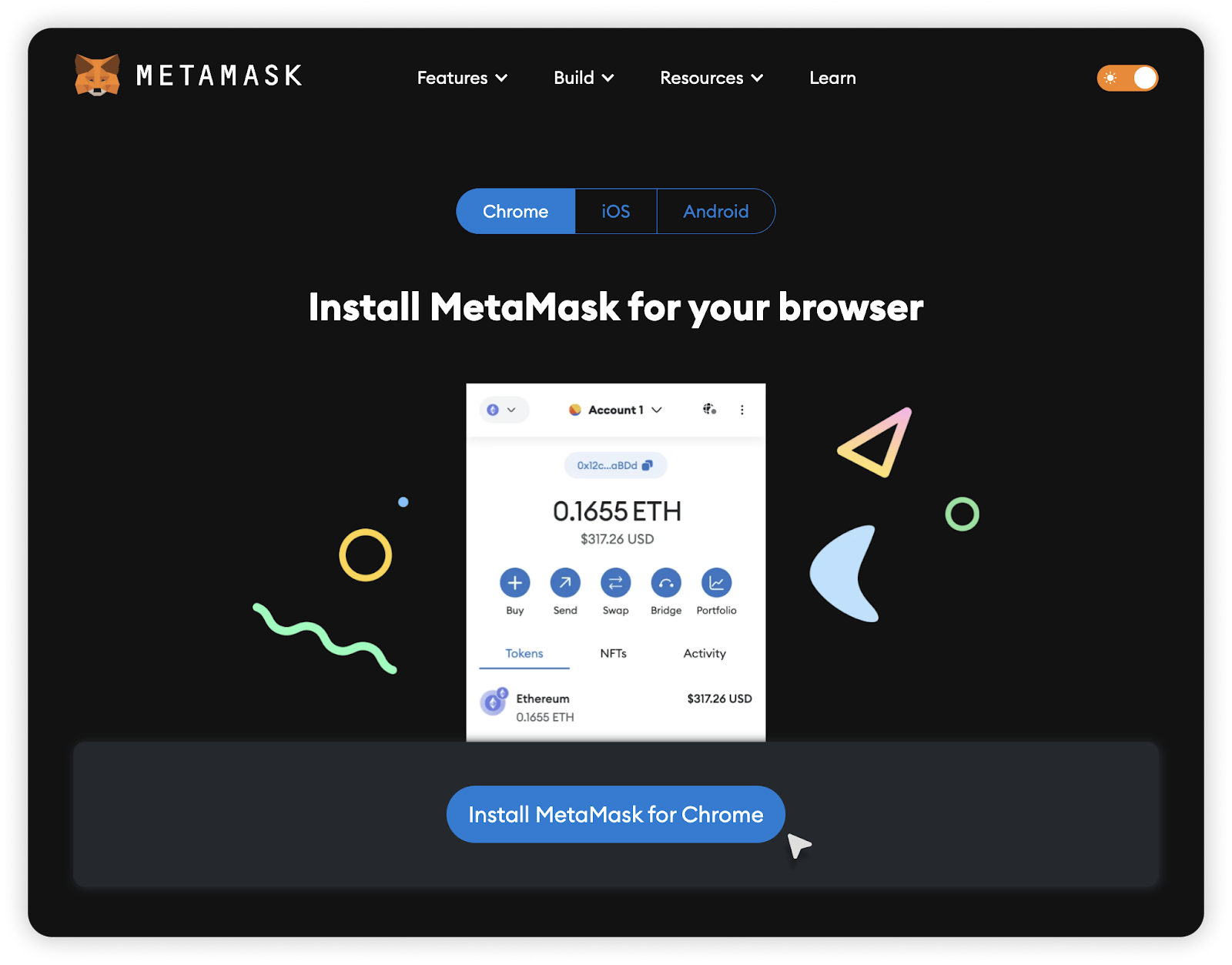 - Aby zacząć korzystać z portfela, należy zainstalować rozszerzenie do przeglądarki lub mobilną aplikację MetaMask. Wybierz typ swojego urządzenia (komputer (rozszerzenie do przeglądarki), urządzenie mobilne (IOS, Android)) i kliknij przycisk „Install MetaMask” (Zainstaluj MetaMask).