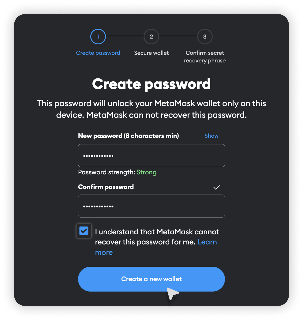 - Następnie utwórz silne hasło składające się z co najmniej 8 znaków i kliknij przycisk „Create a new wallet” (Utwórz nowy portfel).