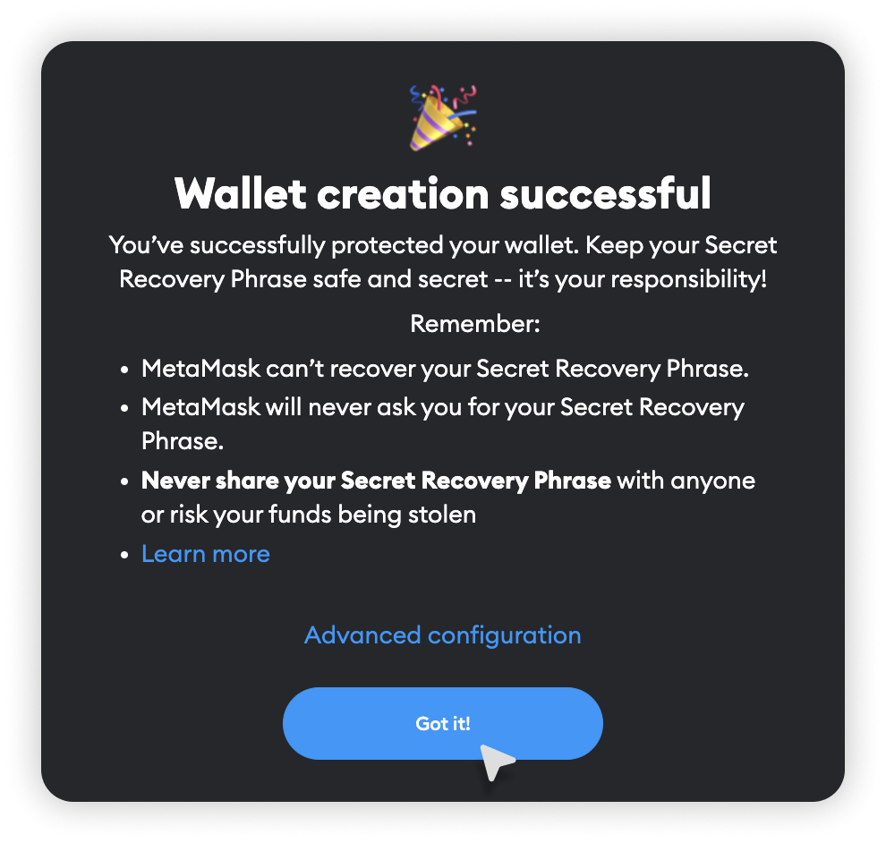 Gotowe! Stworzyłeś własny portfel MetaMask.