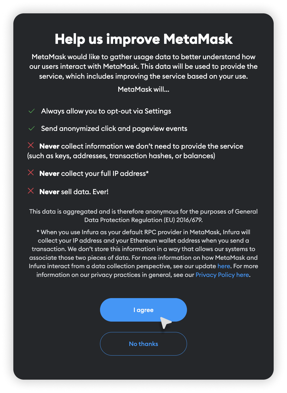 - Wybierz, czy chcesz wysyłać anonimowe dane do MetaMask w celu poprawy usługi (nie jest to obowiązkowe).