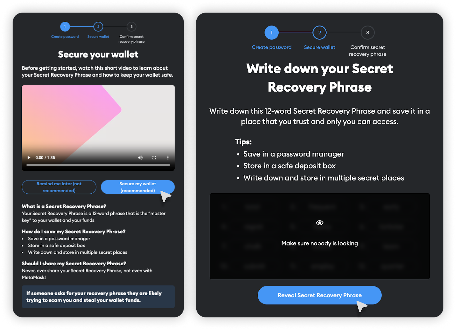 - Zapisz Secret Recovery Phrase (SRP), klikając przycisk „Secure my wallet” (Zabezpiecz mój portfel) - „Pokaż słowa mnemoniczne”. Jest to seria słów automatycznie generowanych przez twój portfel kryptowalutowy, która zapewnia dostęp do niego. Secret Recovery Phrase (Sekretna fraza odzyskiwania) jest również podstawowym mechanizmem odzyskiwania dostępu do portfela. Możesz obejrzeć krótkie wideo na temat SRP i przeczytać więcej informacji poniżej.