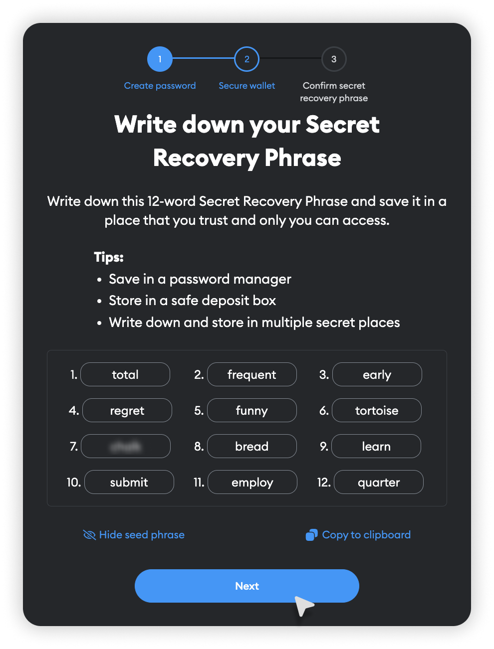 - Po upewnieniu się, że zapisałeś Sekretną frazę odzyskiwania, kliknij przycisk „Dalej”, aby przejść do następnego kroku.