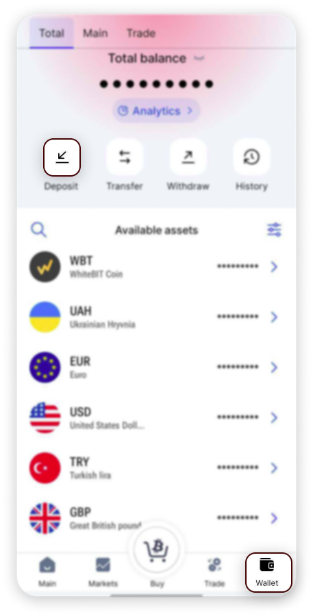 w prawym dolnym rogu ekranu (w aplikacji WhiteBIT, w prawym górnym rogu, nacisnąć