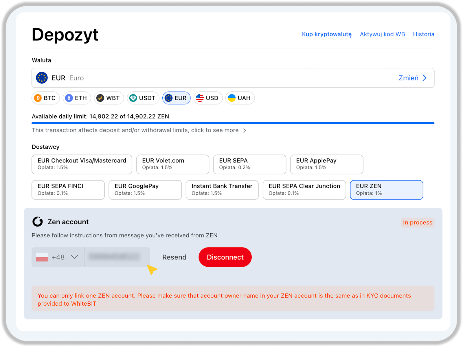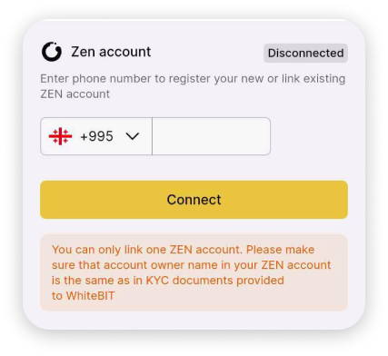 Pamiętaj, że możesz połączyć tylko jedno konto ZEN. Upewnij się, że imię i nazwisko właściciela konta ZEN jest zgodne z dokumentami KYC dostarczonymi WhiteBIT.