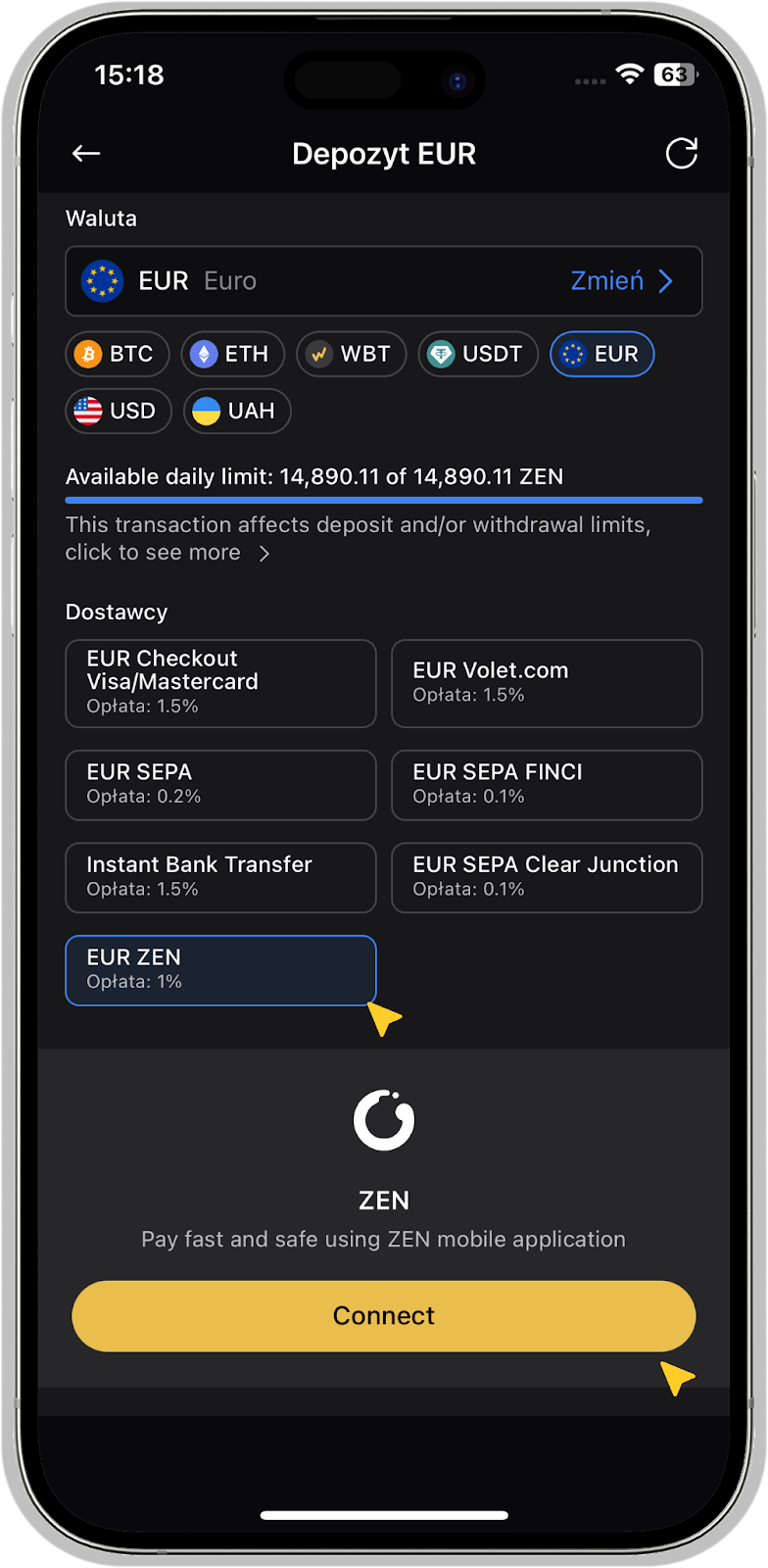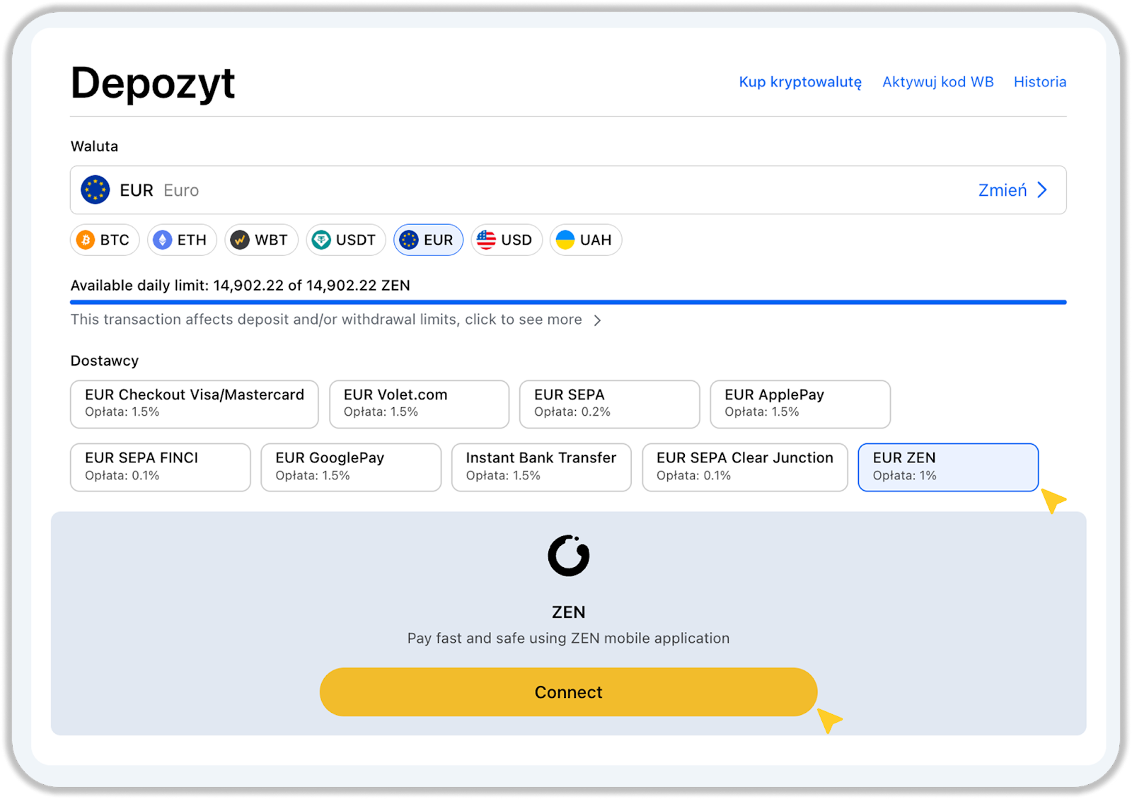 Aby wpłacić środki EUR przy użyciu ZEN z aplikacji, postępuj zgodnie z poniższą instrukcją krok po kroku: