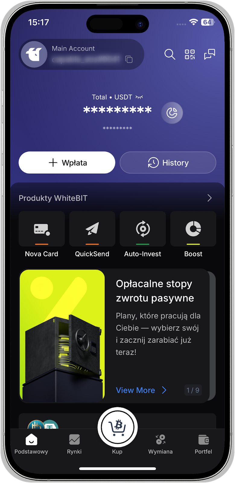 - Na głównej stronie aplikacji przejdź do zakładki "Portfel" i kliknij przycisk "Depozyt".