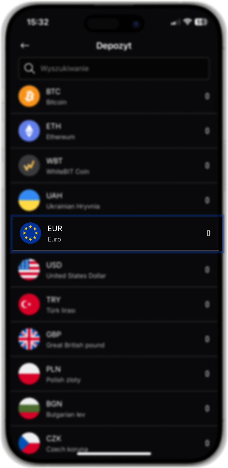- Kliknij "Depozyt" w linii naprzeciwko oznaczenia waluty Euro (EUR).