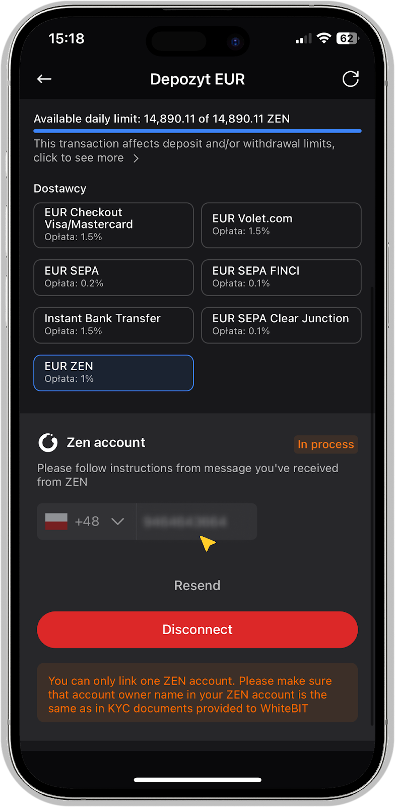 Zwróć uwagę, że możesz połączyć tylko jedno konto ZEN. Upewnij się, że imię i nazwisko właściciela konta ZEN jest zgodne z dokumentami KYC dostarczonymi WhiteBIT.
