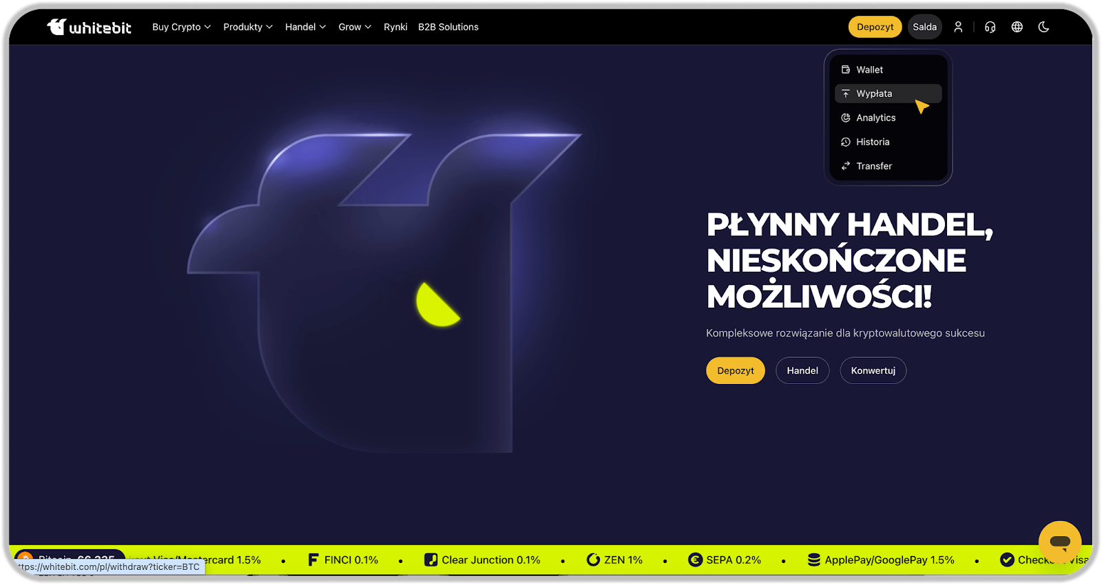 Otwórz główną stronę aplikacji WhiteBIT, możesz przejść do formularza wypłaty poprzez zakładkę "Portfel" - "Wypłata".