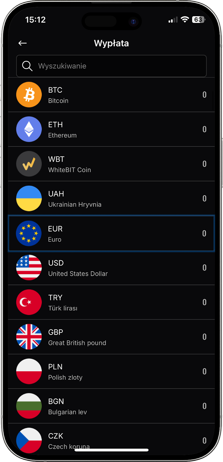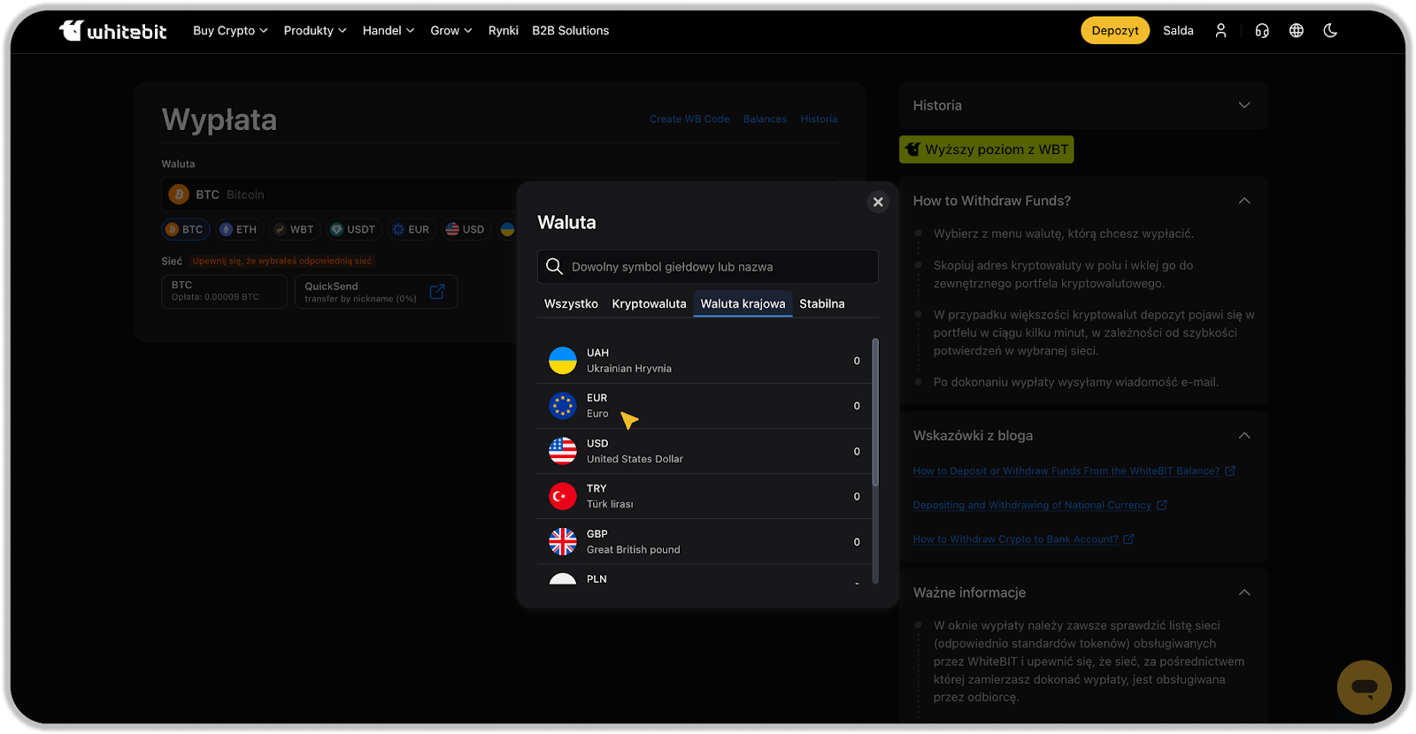 2. Kliknij "Wypłata" w wierszu obok tikeru euro (EUR).