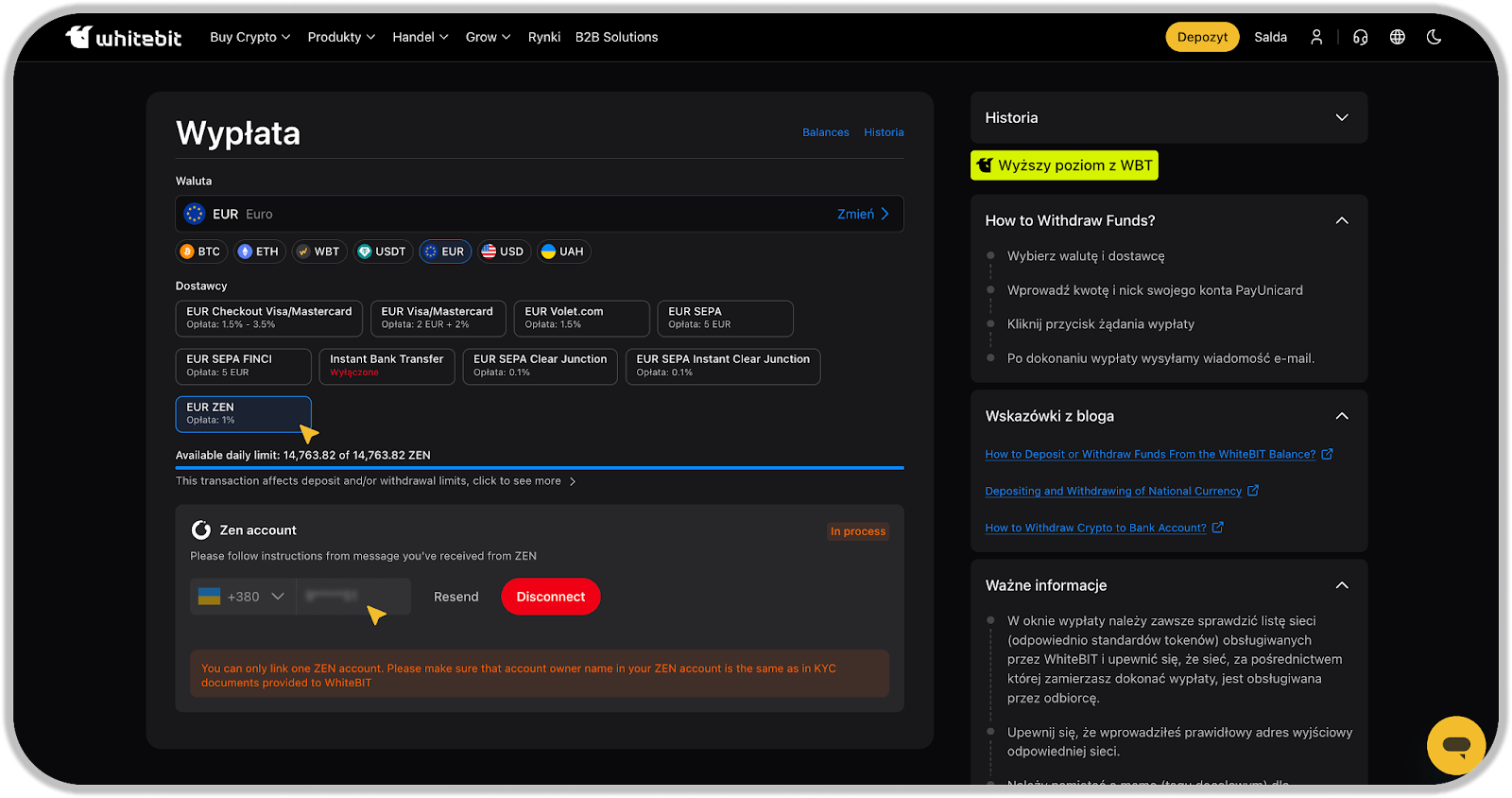 6. Wybierz ZEN jako metodę wypłaty środków w EUR z WhiteBIT. Aby potwierdzić i złożyć wniosek o wypłatę środków, musisz: