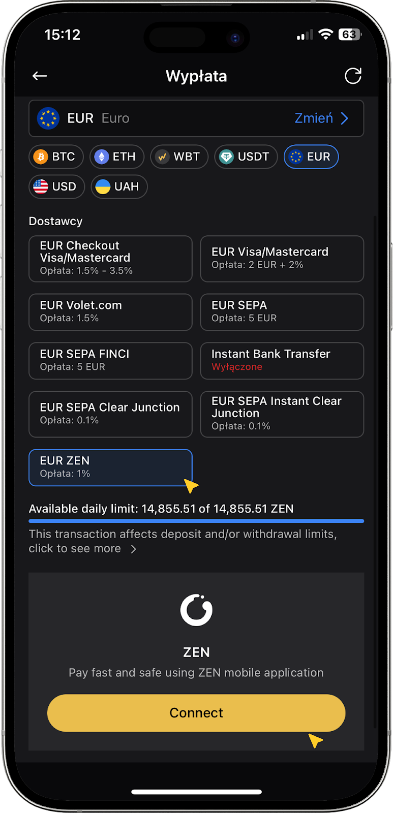 Z opcji płatności wybierz EUR ZEN jako swojego dostawcę płatności.