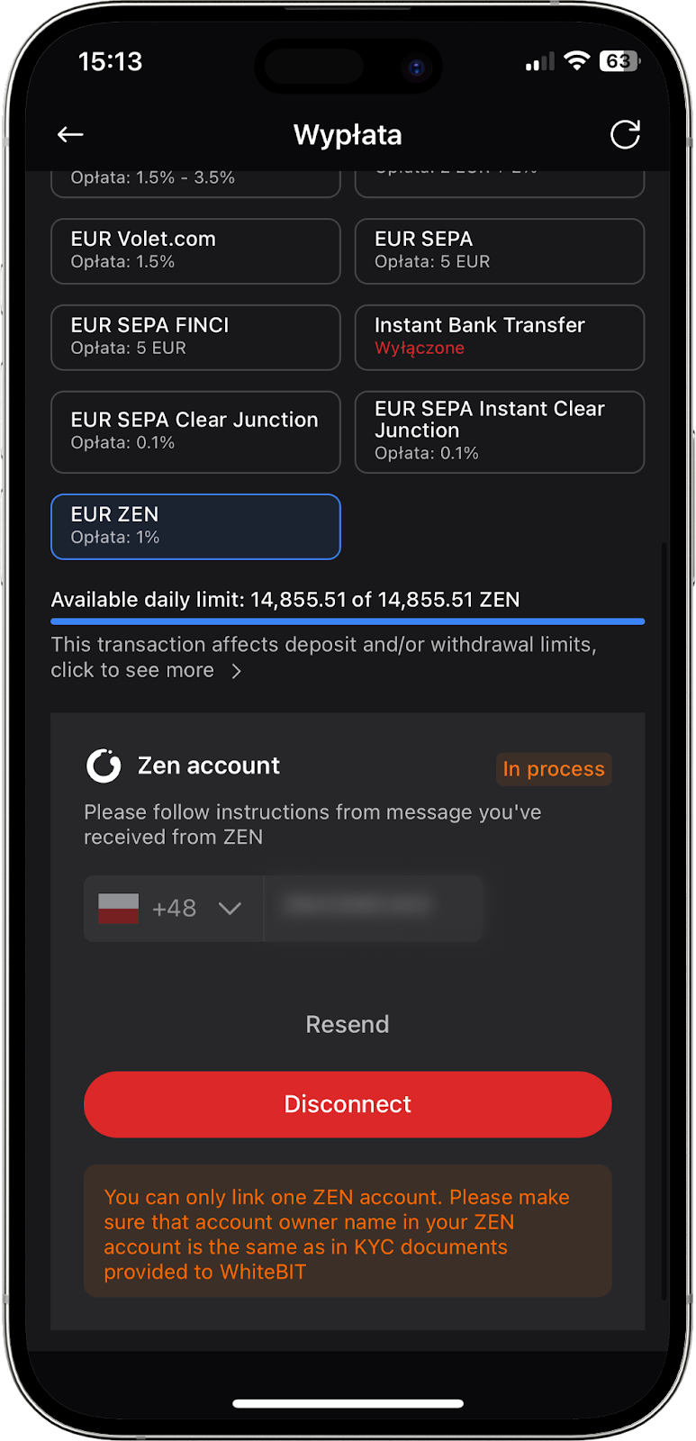 Zwróć uwagę, że możesz podłączyć tylko jedno konto ZEN. Upewnij się, że imię właściciela konta ZEN jest zgodne z imieniem właściciela konta w dokumentach KYC dostarczonych na WhiteBIT.