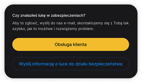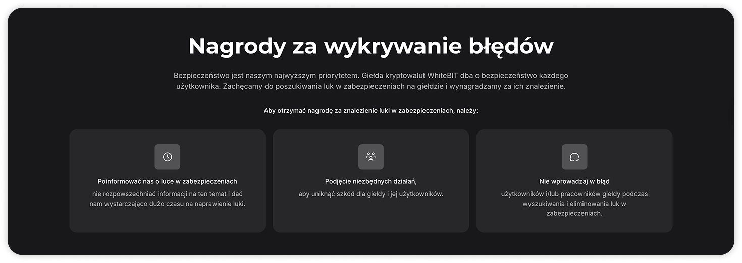 Możesz to zrobić, wysyłając raport na adres e-mail security@whitebit.com lub klikając odpowiedni przycisk "Wyślij informację o luce do działu bezpieczeństwa" na stronie programu.