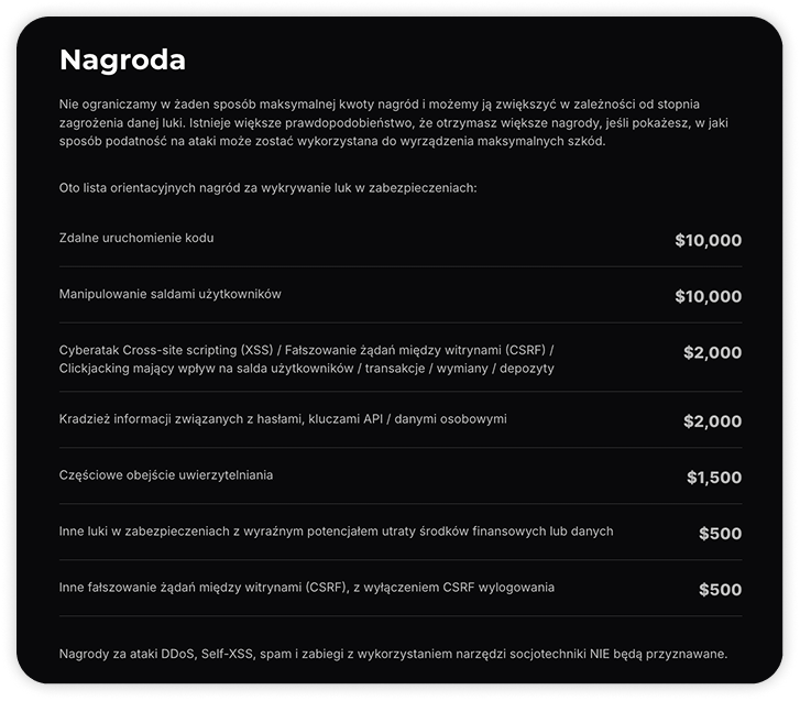 Zwróć uwagę: giełda sama określa poziom ryzyka dla każdego zgłoszonego błędu po dokładnej weryfikacji i potwierdzeniu istnienia błędu lub podatności. Ważne jest, aby pamiętać, że ataki DDoS, Self-XSS, Spam, Social engineering nie podlegają nagrodzie.
