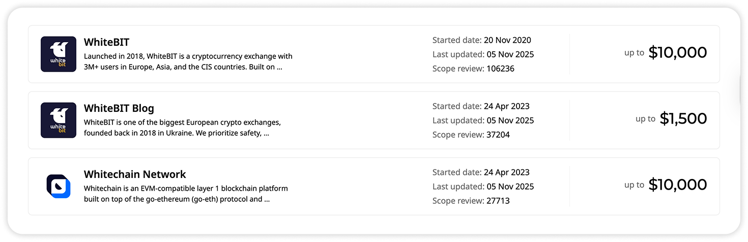 Bug Bounty to aktywność, która pozwala otrzymać nagrodę za wykrywanie różnych wrażliwości na giełdzie. Ponieważ bezpieczeństwo i niezawodność są głównymi zasadami funkcjonowania giełdy WhiteBIT, wprowadziliśmy program Bug Bounty, który ma na celu wykrywanie błędów i podatności.