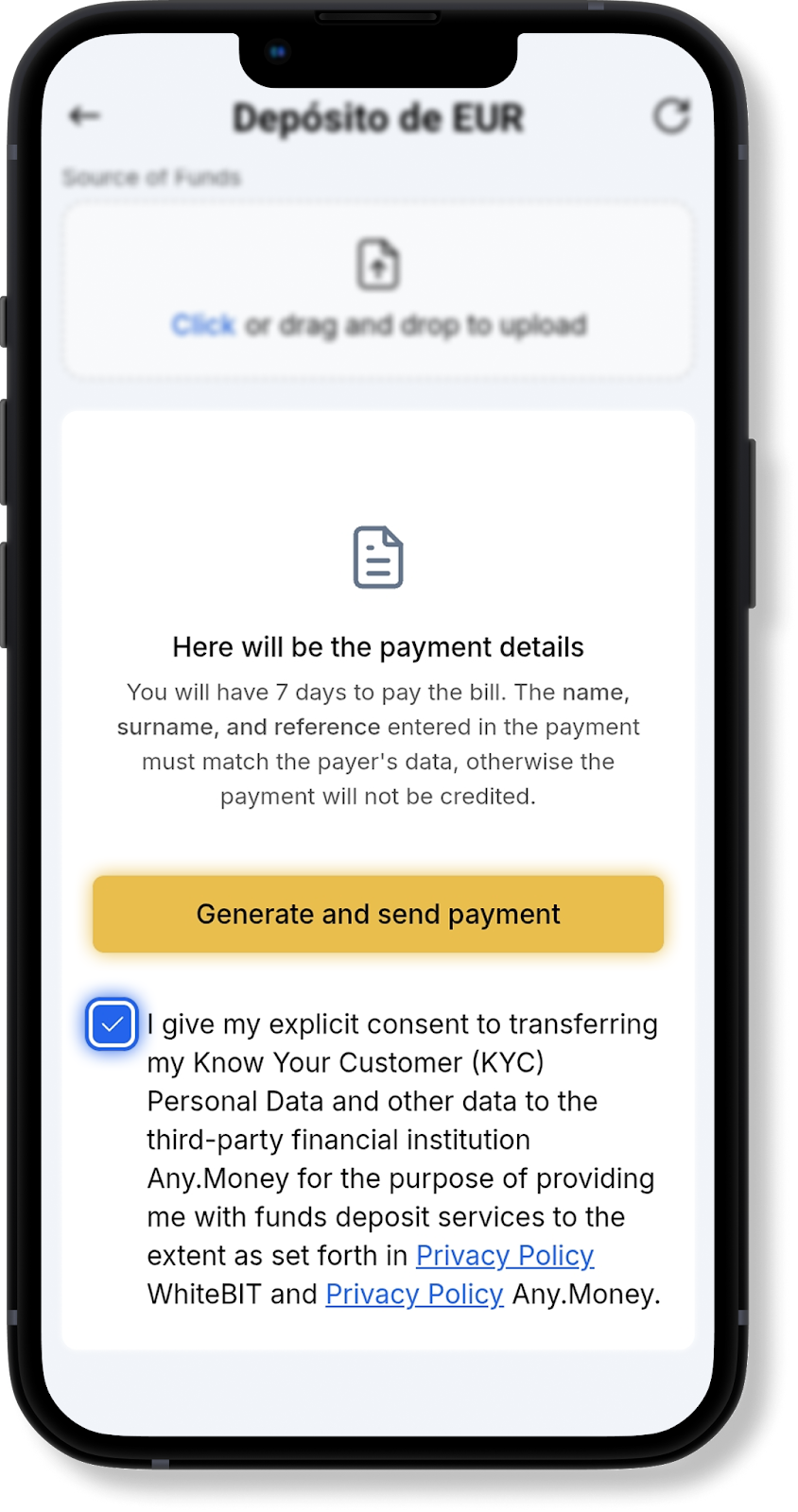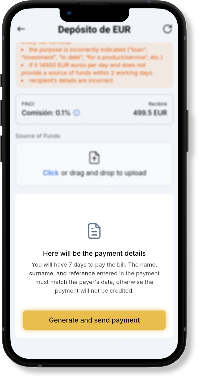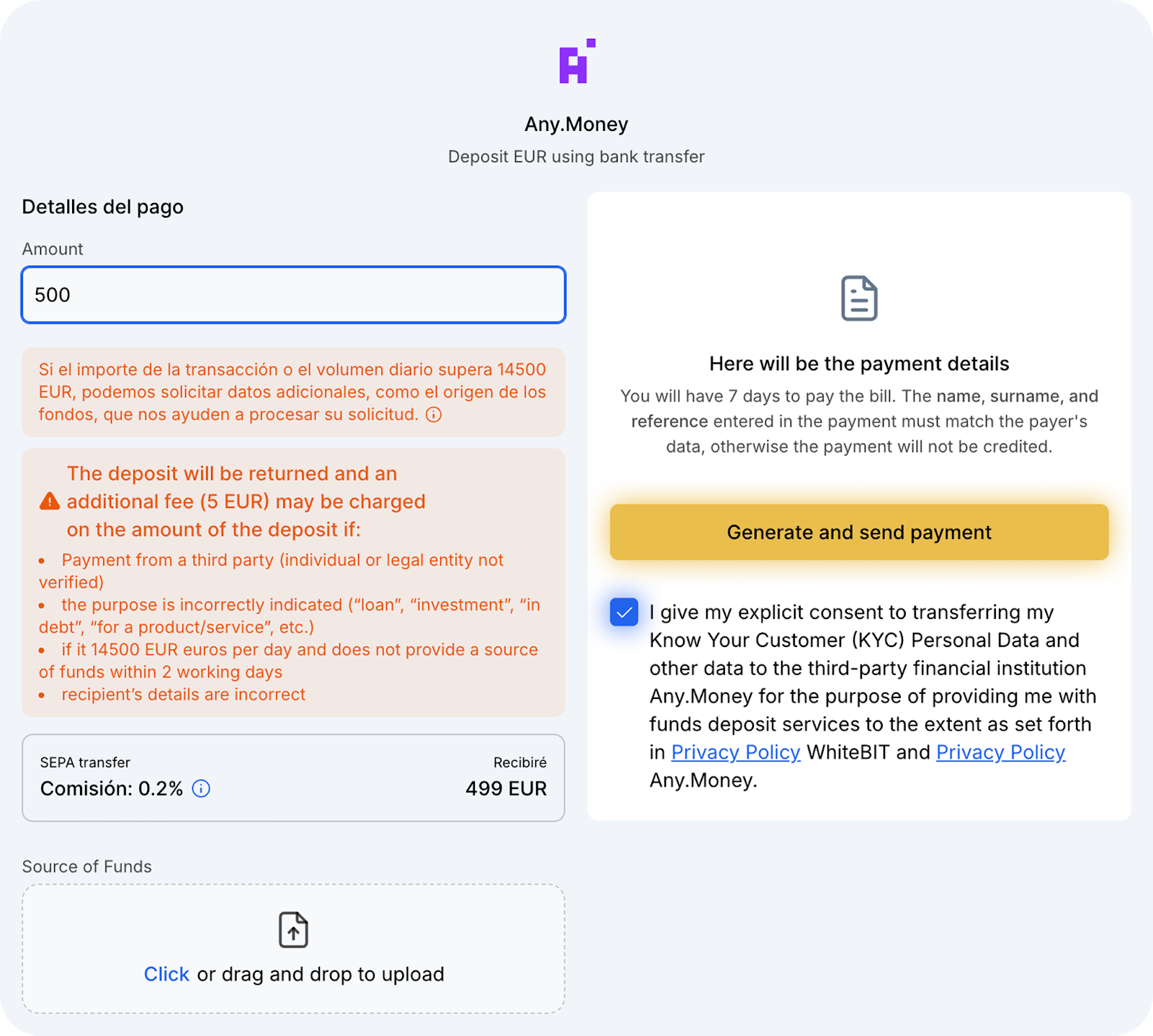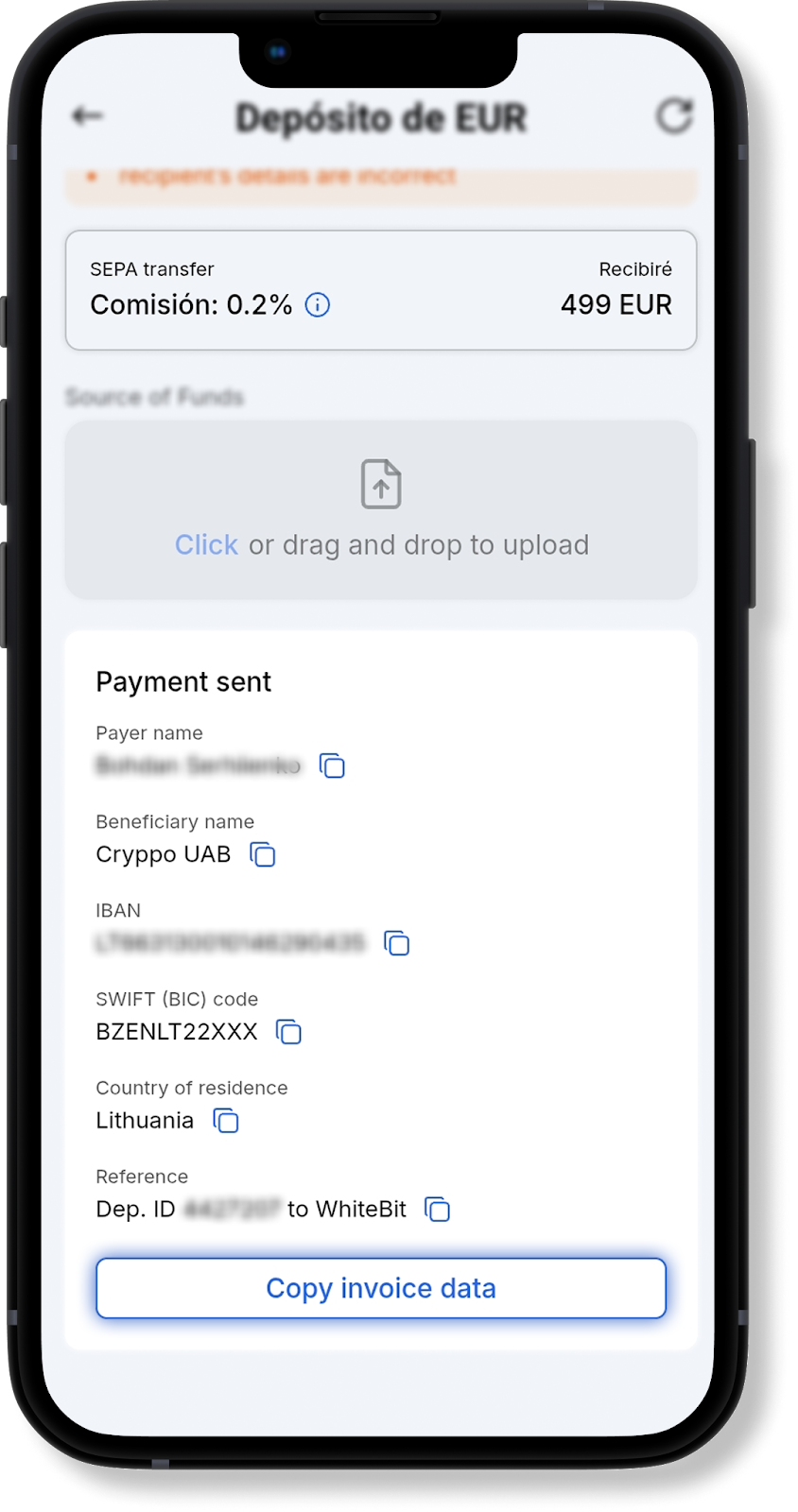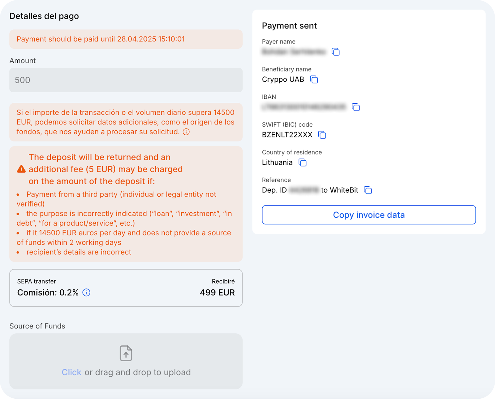 Al recargar con EUR SEPA, el nombre y apellido del remitente de los fondos deben coincidir con los indicados en los detalles de pago. De lo contrario, el pago no será acreditado.