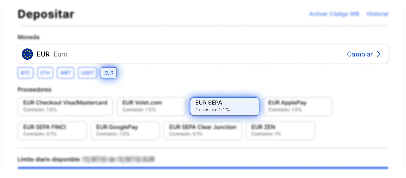 Luego, haga clic en el botón "Depositar" y en el formulario de recarga, seleccione el proveedor "EUR SEPA" y haga clic en el botón "Continuar".