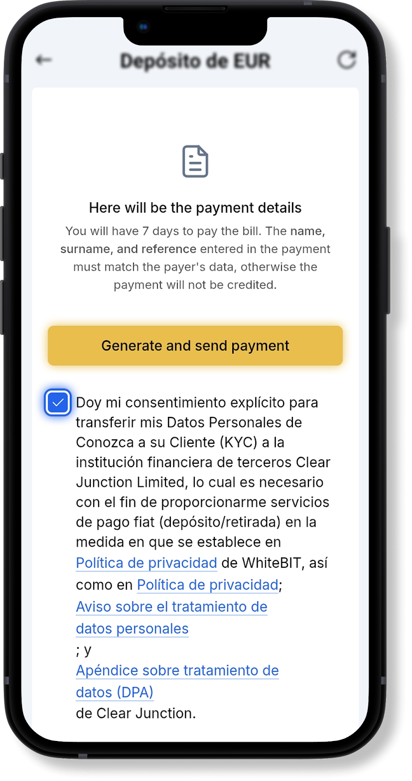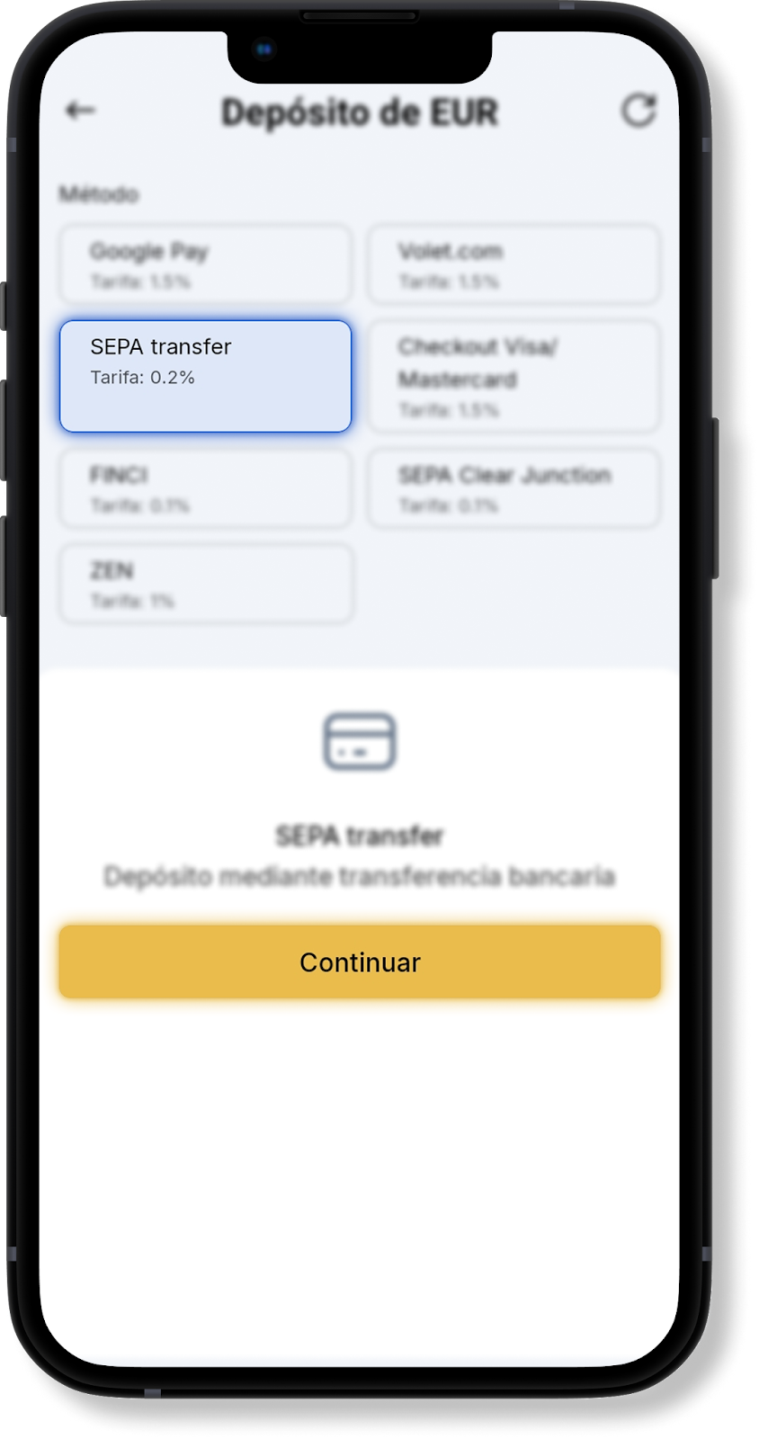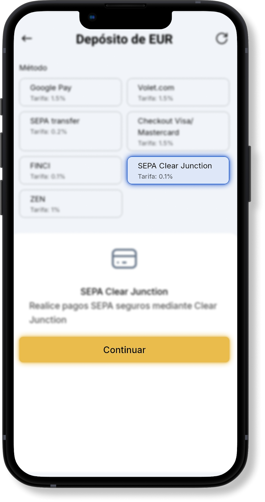 Depósito EUR SEPA Clear Junction en la aplicación