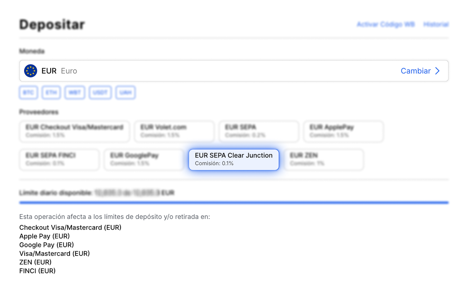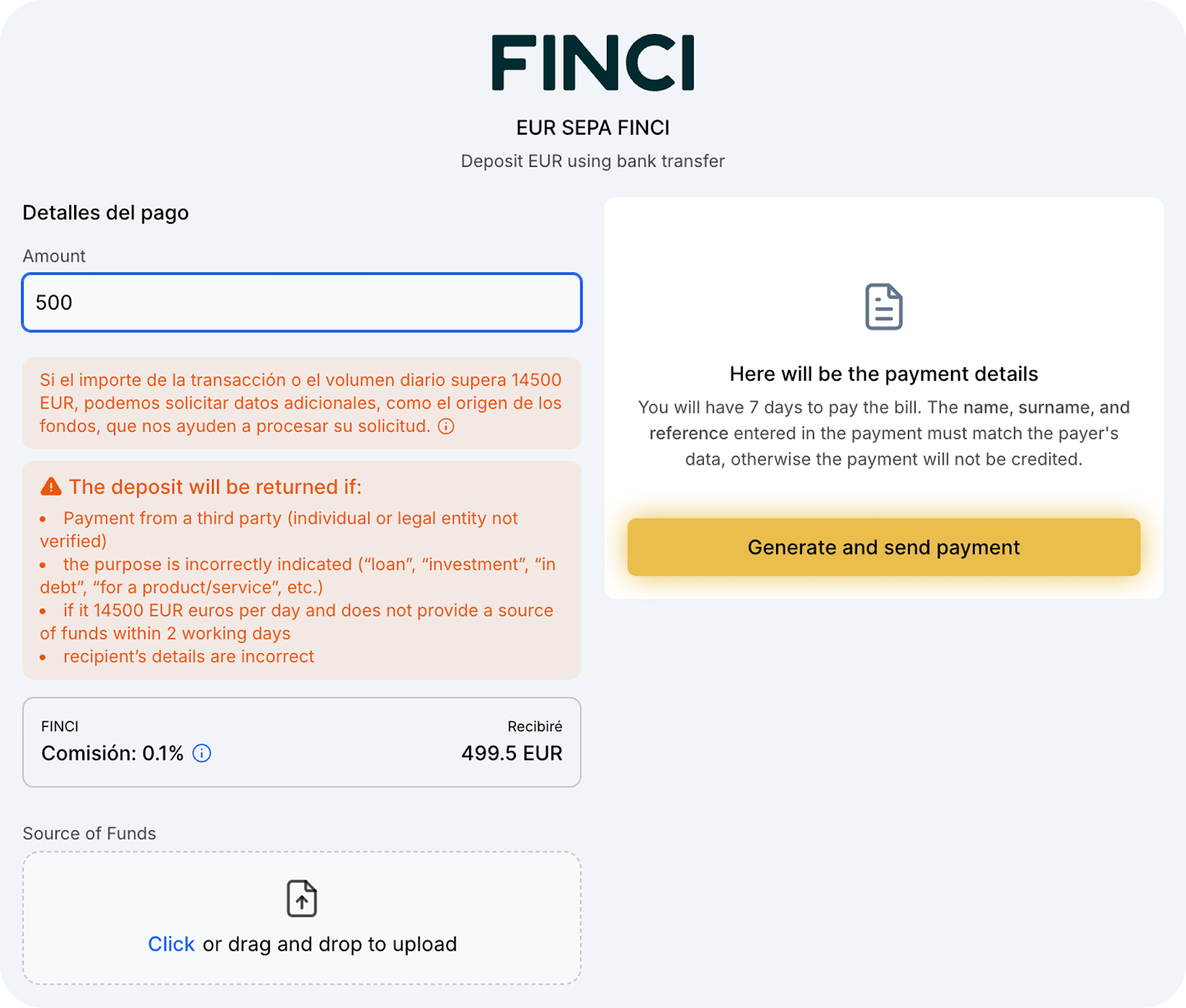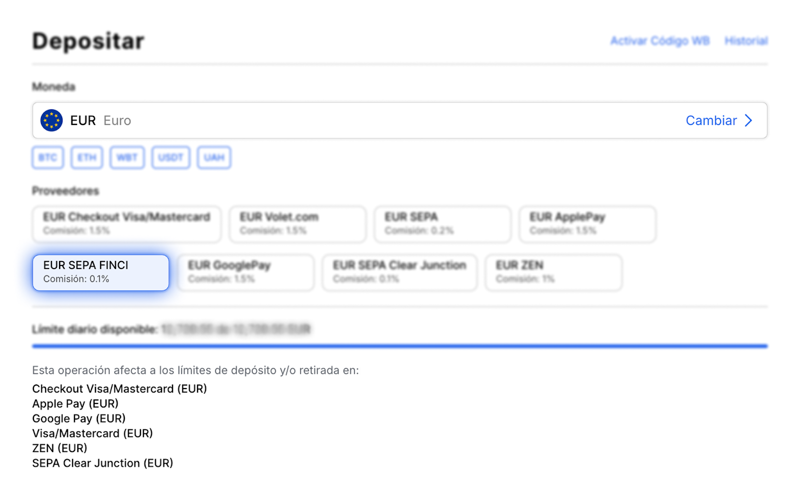 Otro proveedor para recargar EUR es SEPA FINCI. A continuación, le explicamos las condiciones principales y los límites al utilizar este método de recarga.