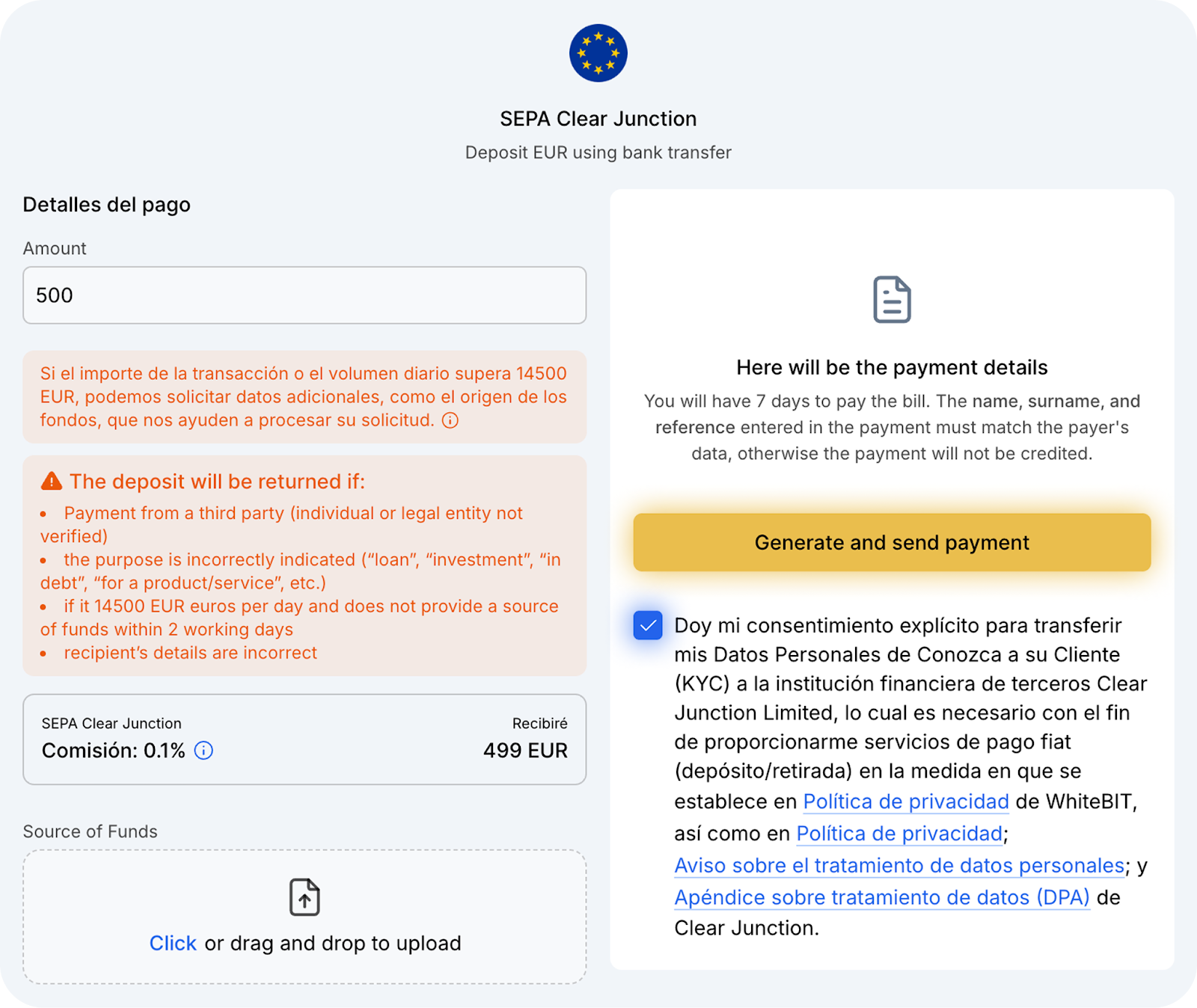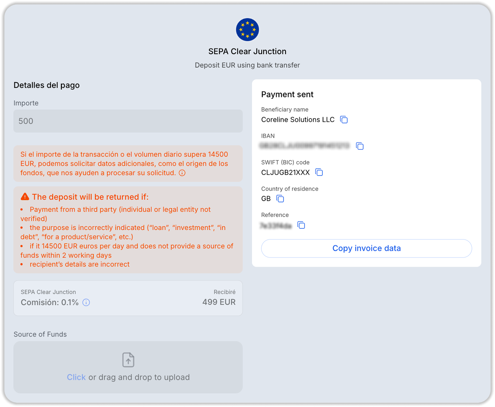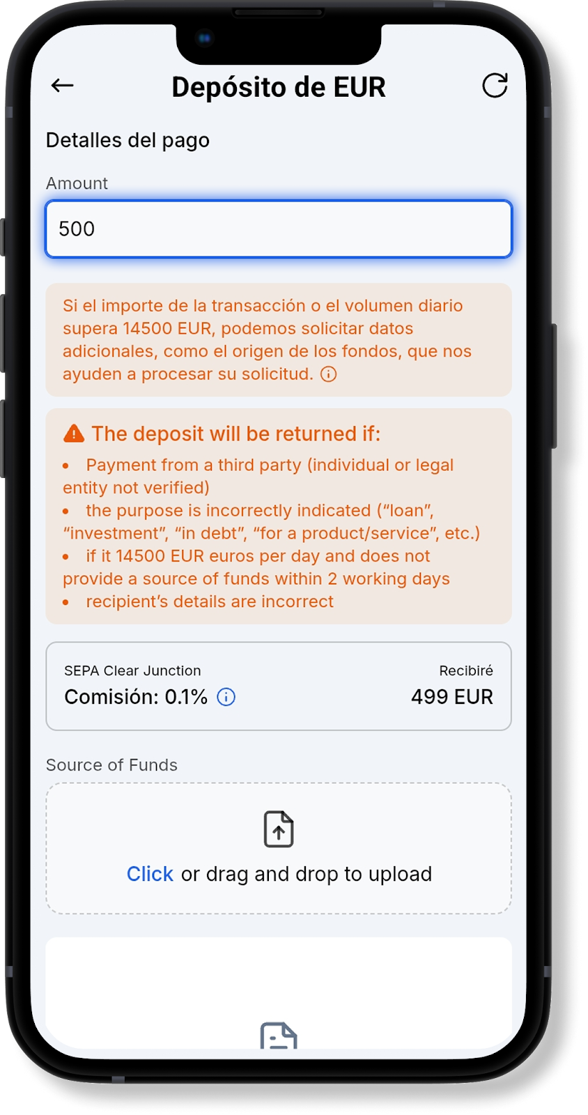 En la ventana de recarga EUR SEPA y EUR SEPA Clear Junction, verá un mensaje indicando que si la suma de la transacción o el volumen diario supera los 14 500 EUR, será necesario proporcionar un SOF (Source of Funds, o "Fuente de los Fondos"). Esto es un requisito de nuestro banco asociado. Puede ver la lista completa de documentos requeridos al pasar el cursor sobre el icono .